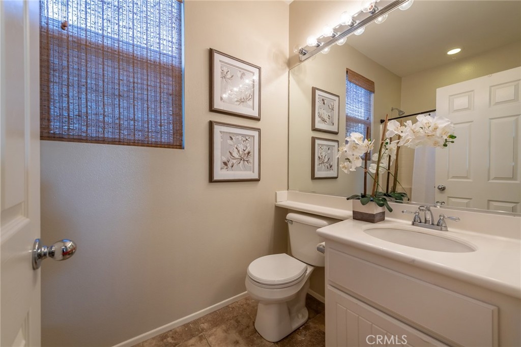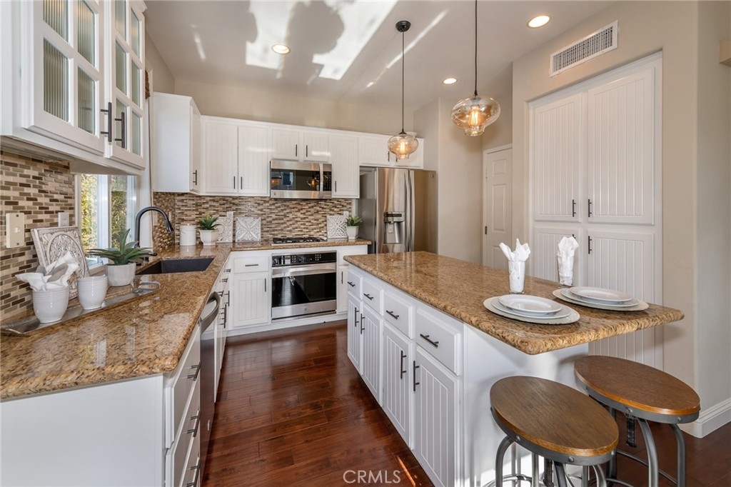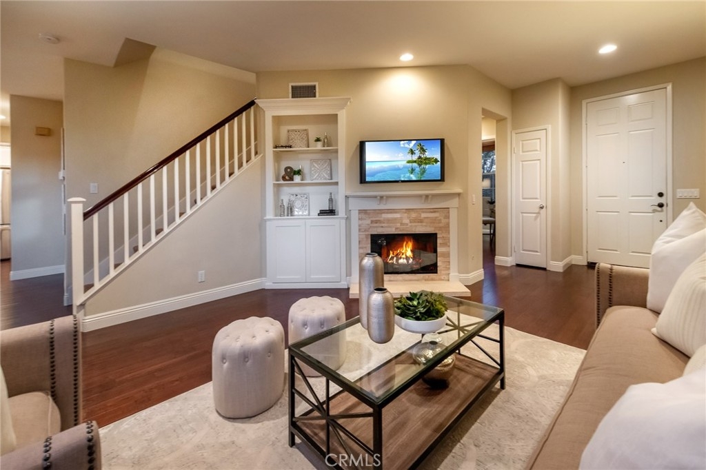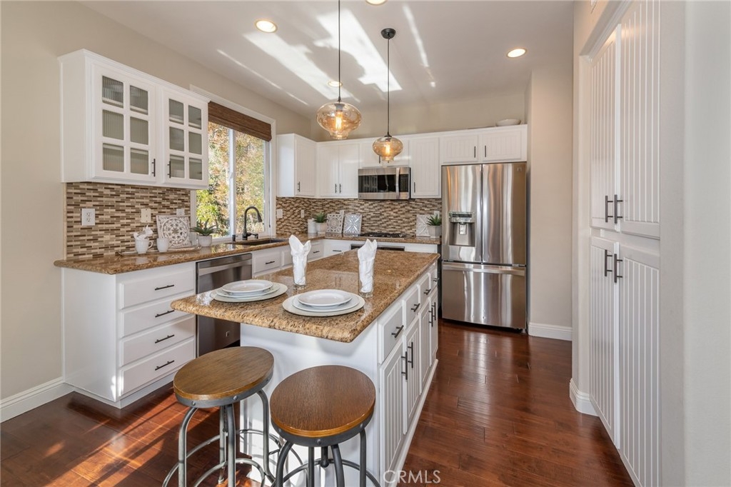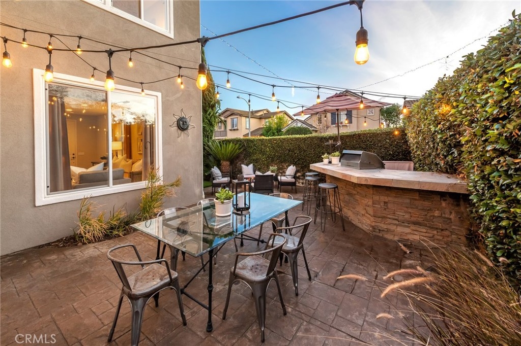 This beautiful, highly upgraded, turn-key home on a corner lot offers four bedrooms and a large loft area upstairs with built-in cabinets. A full bedroom and bathroom can be found on the downstairs main level. Gleaming hardwood floors on the main level and gourmet kitchen featuring white designer cabinets, granite countertops, upgraded SS appliances including refrigerator, center island/breakfast bar, pendant lighting and stone mosaic backsplash. The kitchen opens to a private dining area and living room with cozy fireplace and builder installed surround sound system. Open the large sliding glass door to the outdoor entertaining backyard. Enjoy alfresco dining and entertaining in an outdoor oasis with a built in stainless steel BBQ island including refrigerator for your enjoyment while sitting in you own private backyard spa or gathering around the firepit under the string lights. Recently installed artificial turf looks great and low maintenance! Ascend to the spacious master bedroom offering a walk-in closet with custom built-ins to make your closet well organized. The gleaming white tile master bathroom offers two sinks, separate shower and spa tub for the ultimate relaxation at the end of a long day. 2 additional secondardart bedrooms upstairs share a full bathroom and view balcony. The garage features custom cabinets, a work bench, epoxy coated floor and storage area with pull down ladder to store all your seasonal items. Other features include alarm system, washer/dryer, full driveway and custom window coverings. Hurry, this immaculate home will not last!