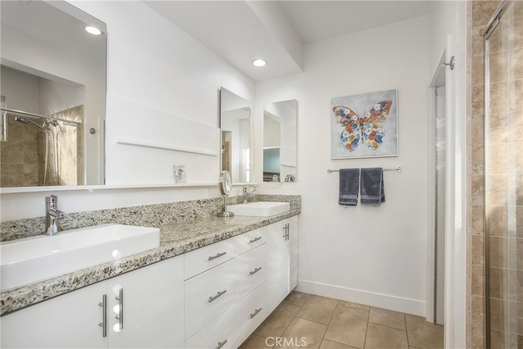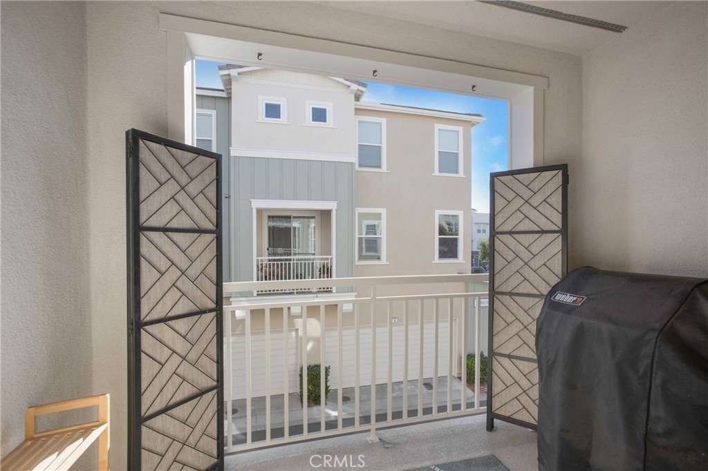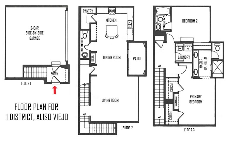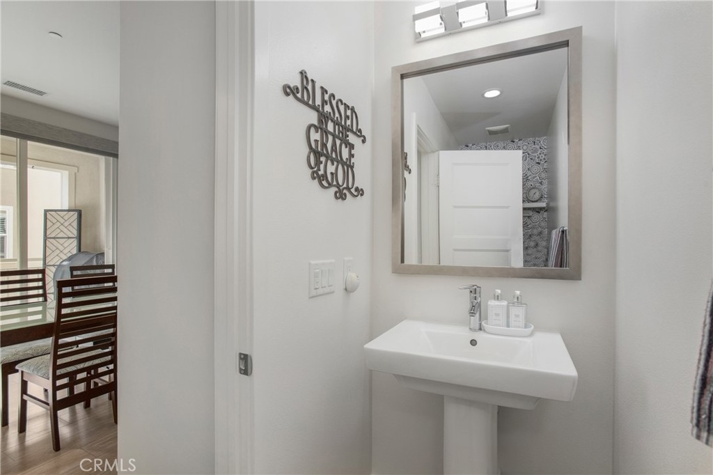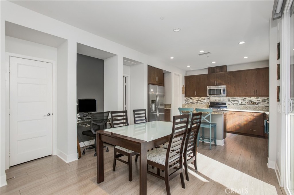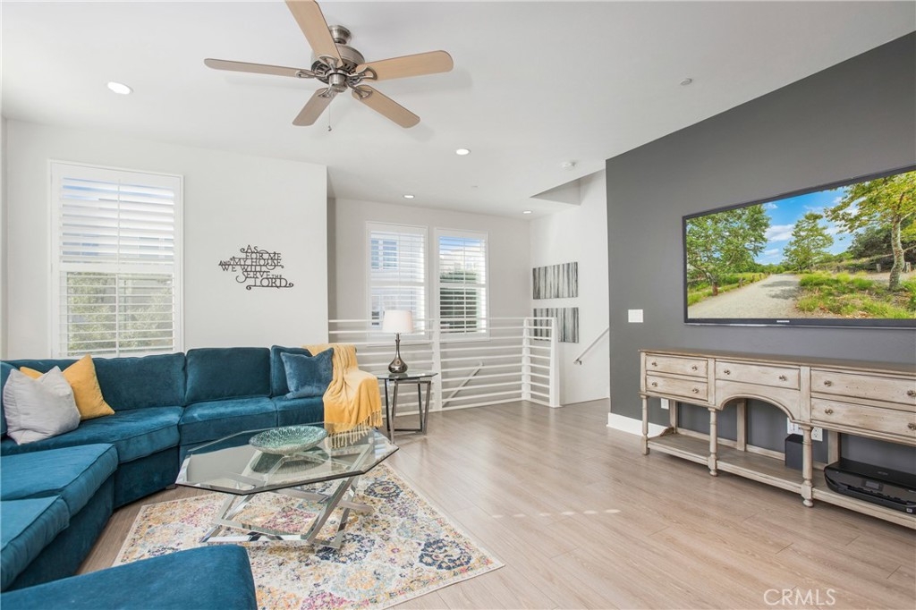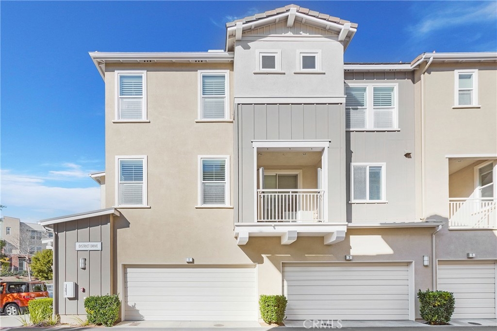 Welcome home to 1 District, a beautifully upgraded end unit home in the Elements at Vantis community which is a mix of natural beauty and soft urban cityscape. The home features an open floor plan, high ceilings, recessed lighting, ceiling fans, plantation shutters, silver oak hardwood floors throughout, and new carpeting on the stairs. The gorgeous kitchen has granite countertops, custom backsplash, a center island with barstool seating, and stainless steel appliances. The spacious living room with a large TV wall and the dining room are open to the kitchen. There is a half bath on this level and a home office area. The covered patio is off of the dining room which is perfect for a barbeque and a couple of chairs to enjoy the sunshine. Upstairs there are two spacious bedrooms each with their own upgraded bathrooms. The primary bedroom has a beautiful ensuite bathroom with granite counters, dual sinks, and a large step in shower. A separate laundry room with space for full size machines is on the upper level. 2 car side-by-side garage is attached with direct access. Enjoy the Vantis lifestyle with luxurious amenities like a gym, billiards room, clubhouse, business center, car washing station, outdoor dining and barbecue areas, and a resort style salt-water, heated pool and spa with covered cabanas. Within walking distance, you will find dining, shopping, and entertainment at the Aliso Viejo Town Center. The Vantis area is slated for excellent schools within the Capistrano school district.