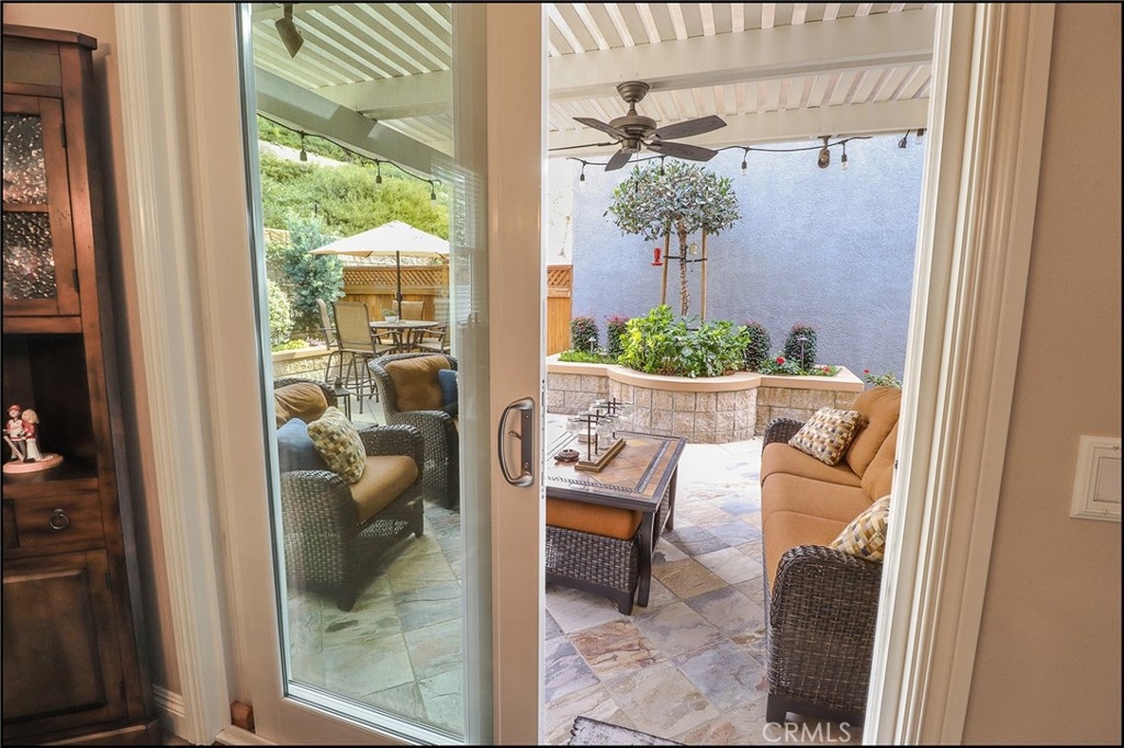 EXCEPTIONAL CANYON VISTAS LOCATION PERFECTLY SITUATED ON THE PERIMETER OF THE HIGHLY SOUGHT AFTER HARVEST TRACT WITH VIEW OF LUSH GREENBELTS, ADDED PRIVACY, AMAZING YARD WITH OUTDOOR LOUNGE AND DINING AREAS AND SPECTACULAR UPGRADES THROUGHOUT! Awesome curb appeal with well manicured landscaping and stone accented walkway leading to the front door, which unveils the foyer and large living room with two-story ceiling and stack stone accented fireplace with custom wrought iron fireplace door. The dining room opens to the stunning kitchen with designer Quartz countertops, lots of cabinets, upgraded appliances and French sliding door to the inviting patio with upgraded alumiwood cover, perfect for outdoor entertainment, lounging and outdoor dining. The amazing backyard is overlooking the lush greenbelts and no one directly behind for added privacy, custom hardscaping featuring stone accents, planters and seating walls, newer lush landscaping with a drip irrigation system and landscape lighting, separate left rear yard and large side yard. Upgraded Milgard tempered glass windows throughout, custom beveled glass accent windows, newly upgraded flooring and neutral paint throughout, newer water heater and LG High Efficiency washer and dryer included, upgraded bathrooms including the newly remodeled master bathroom with soaking tub, whole house fan and PEX repiping. All this plus, a very desirable Canyon Vistas location offering highly sought after schools, easy toll road (73) and beach access (via 133), excellent proximity to Aliso Viejo Town Center and nearby Canyon View park and recreation, and hiking, biking and nature trails!