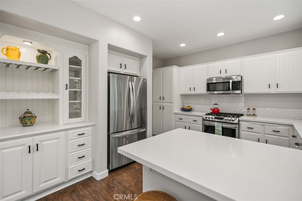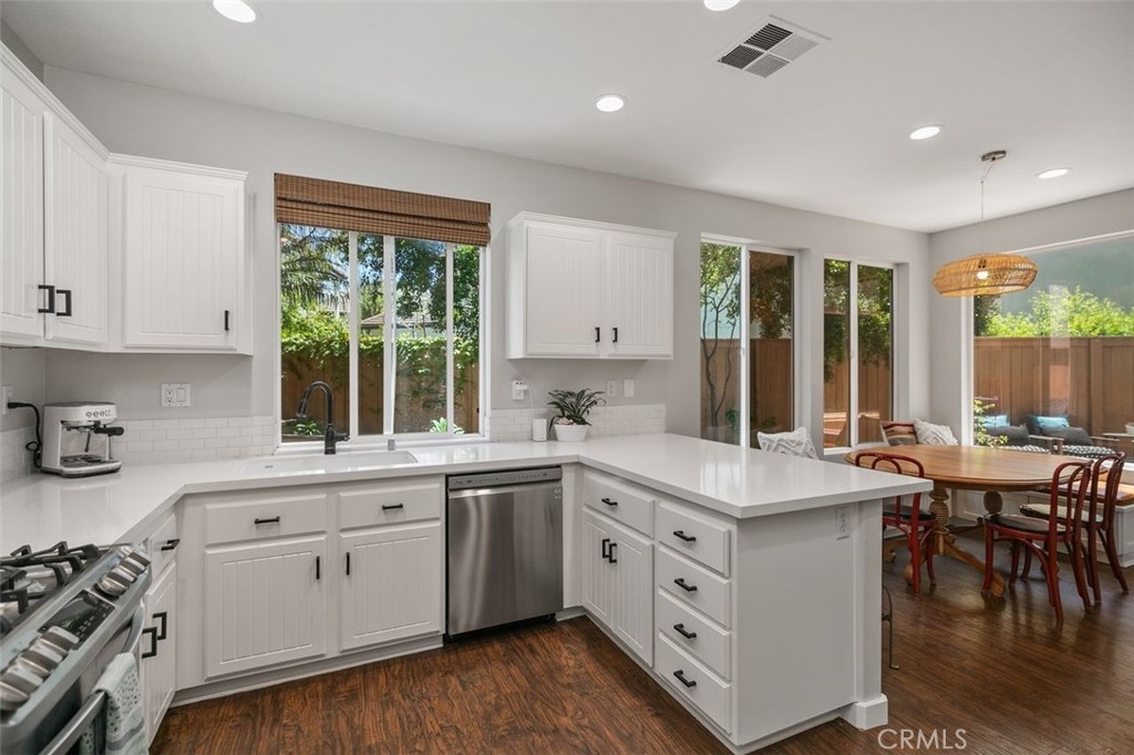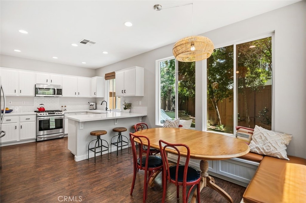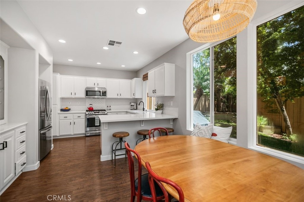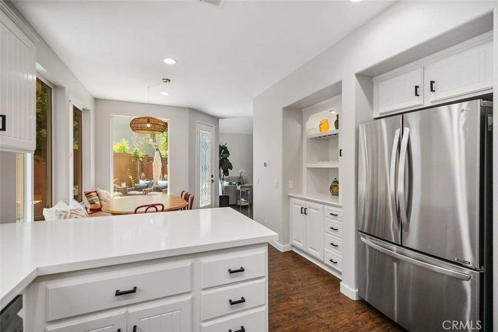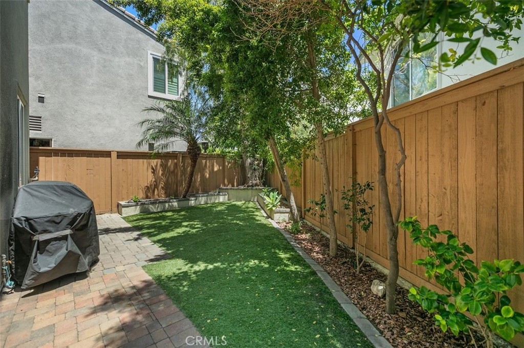 First Woodlands home on the market in more than a year! Tucked at the end of a private, single-loaded cul-de-sac in the desirable Woodlands tract of Westridge, this beautifully remodeled 3-bedroom home blends charm, comfort, and convenience in the heart of Aliso Viejo. The curb appeal starts with a sleek concrete paver driveway and continues inside with warm wood laminate flooring throughout. The cozy living room features custom built-ins, a fireplace with a hewn wood mantel and hexagonal tile surround, and opens into an updated white kitchen showcasing quartz countertops, subway tile backsplash, beadboard cabinets, matte black hardware, stainless steel appliances, and a built-in hutch with wine storage. The adjoining dining room connects both rooms seamlessly with a sunny breakfast nook featuring a built-in bench and cabinet, perfect for casual dining or weekend brunch. A stylish powder room completes the main floor with Mediterranean-patterned tile, plantation shutters, and a pedestal sink lit by charming vanity fixtures. Upstairs, the spacious primary suite has an en suite bath with ceramic tile flooring, dual-vanity, shaker-style cabinetry, and an open walk-in closet. Two additional bedrooms share a Jack & Jill bathroom with dual-vanity, tile floors, and plantation shutters. The extra-large backyard continues the elegant paver hardscape from the front, complemented by low-maintenance artificial grass and raised planters, perfect for outdoor entertaining or relaxing evenings at home. Additional highlights include full-home PEX repiping for peace of mind, extra storage cabinets in the garage, and a prime location just a short stroll to Westridge Park and highly sought-after Canyon Vista Elementary. This is a rare opportunity to own a home in one of Aliso Viejo’s most coveted neighborhoods. Schedule your private tour today!