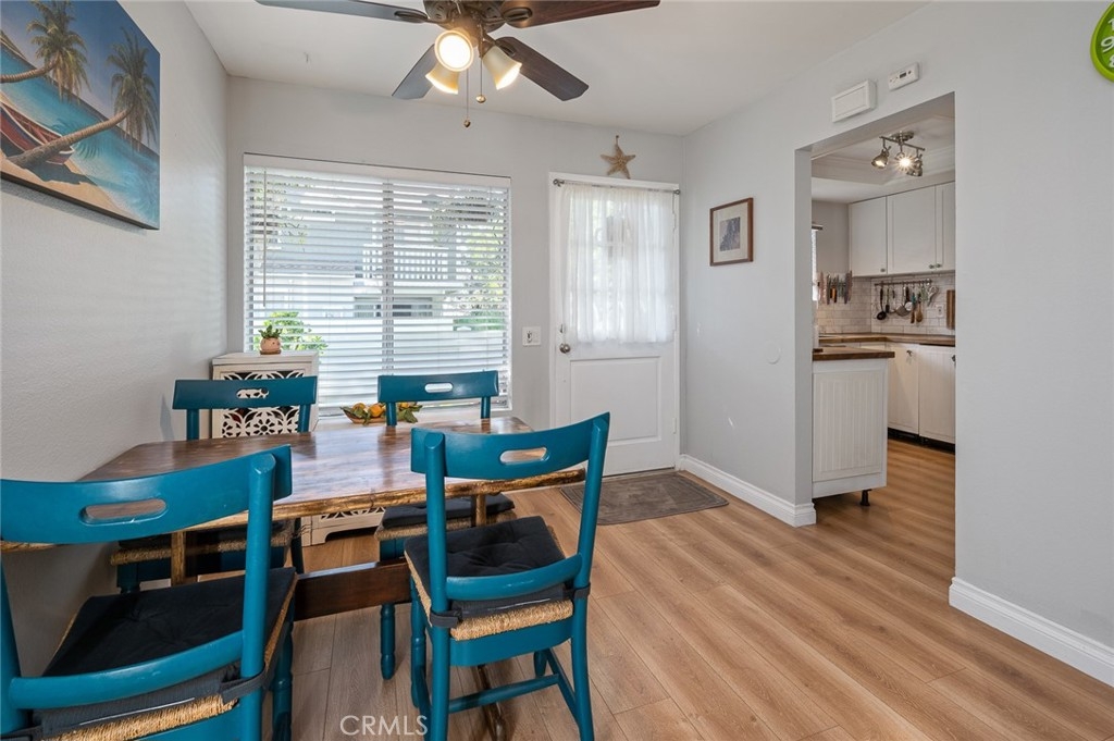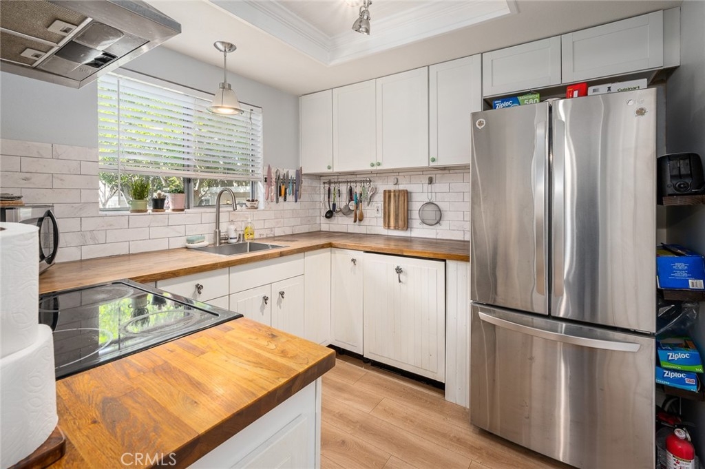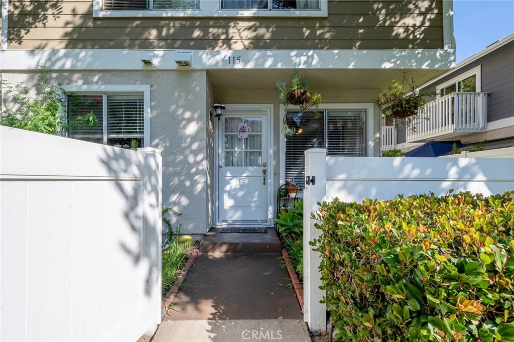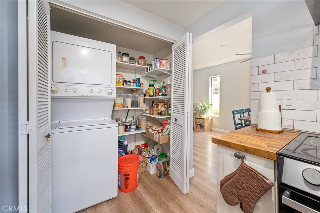 A corner-unit, sharing one wall, noone above or below, with lots of natural lights. 3 bedroom, 1.5 bath, two-story townhouse. 1st floor has light color laminate flooring, remodeled kitchen with recessed ceiling, butcher-block countertops, subway tile backsplash, stainless-steel stove. and white shaker cabinets. Kitchen closet has washer/dryer and pantry. Living room has a spacious layout, walk-in closet and sliding doors that lead to a private enclosed back patio that has outdoor storage closet with a newer water heater. The 2nd floor has light color carpet. Master bedroom has vaulted ceilings with a patio overlooking the courtyard. 1 carport with locable storage cabinet and 1 parking space included. Community has pool, hot tub and grill area and convenience location, close to stores, restaurants.