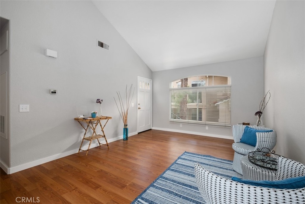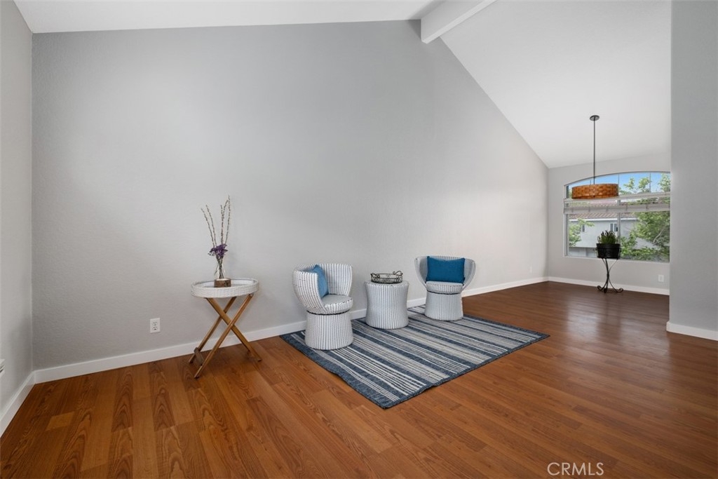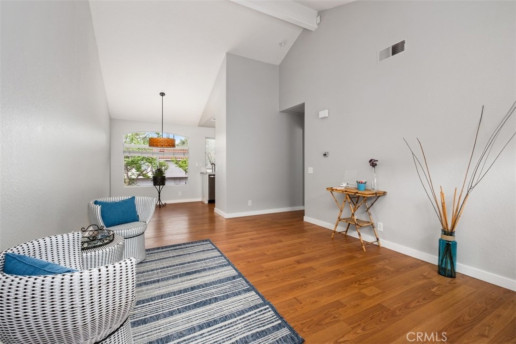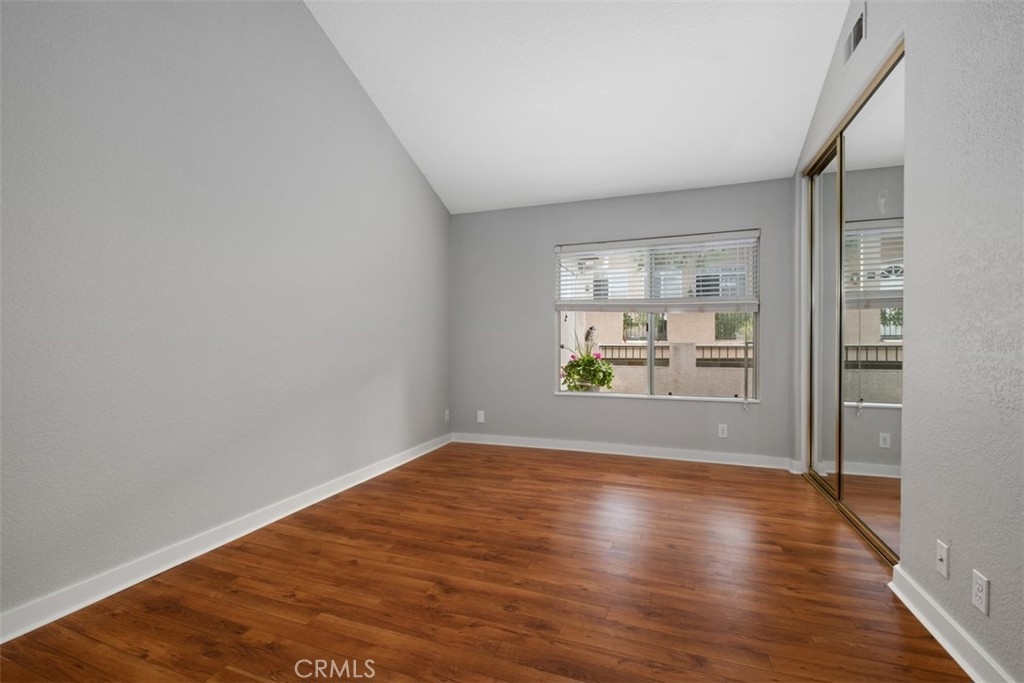 Open and bright with vaulted ceilings makes this carriage unit (no one below or above you) exceptional. Great opportunity to purchase in Aliso Viejo, Laguna Audubon. Seagate Colony is unique with expansive grassy areas, beautiful trees and two large pools. Centrally located minutes to the Toll Road, 5 miles to Lagunas Main Beach. Drive on Laguna Canyon Road to Laguna with its wonderful atmosphere, fine restaurants, amazing art, and wonderful beaches and coves. As you enter your privated gated deck , you are invited into a spacious living room with large windows that sprinkle natural light into your home. Great open space for your living room with vaulted ceilings as well as in the bedroom. There is a dining area off of the kitchen. Newly painted interior with new baseboards, recessed lighting in the kitchen and brand new Stainless Steel Appliances just installed. The large ensuite bedroom has two large mirrored closets, a skylight in the bathroom, and a large window overlooking the private gated deck.. Enjoy the sunshine on your private deck, which also houses the enclosed laundry room, large enough for standard washer and dryer, with cabinetry. There is also a gas outlet for your barbeque. Beautiful wood flooring throughout the entire home. Seagate Colony offers two large swimming pools, two spas, a newly renovated gym, and a Clubhouse as well as large trees with lots of grassy areas and meandering sidewalks. Great opportunity for first time buyers, investors, or use as a second home. Great neighborhood with hiking and biking trails, centrally located and just a few miles to the beach. Large extended private one car garage comes with this condo, with lots of visitor parking. Painting exterior is planned for the fall.