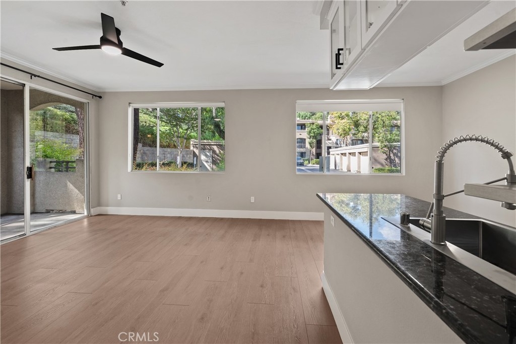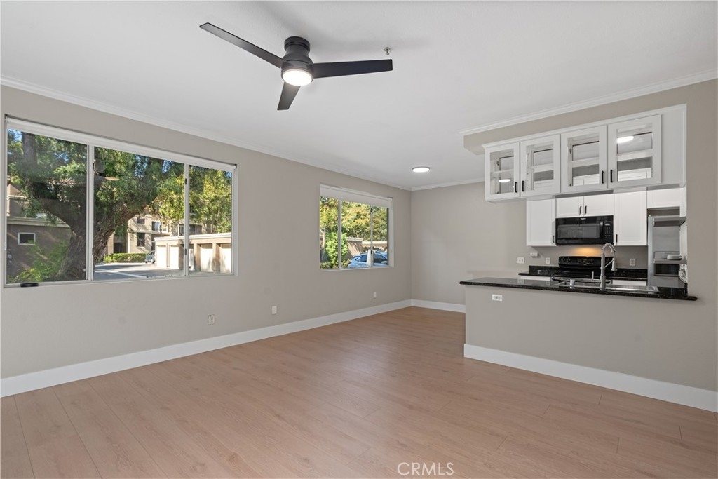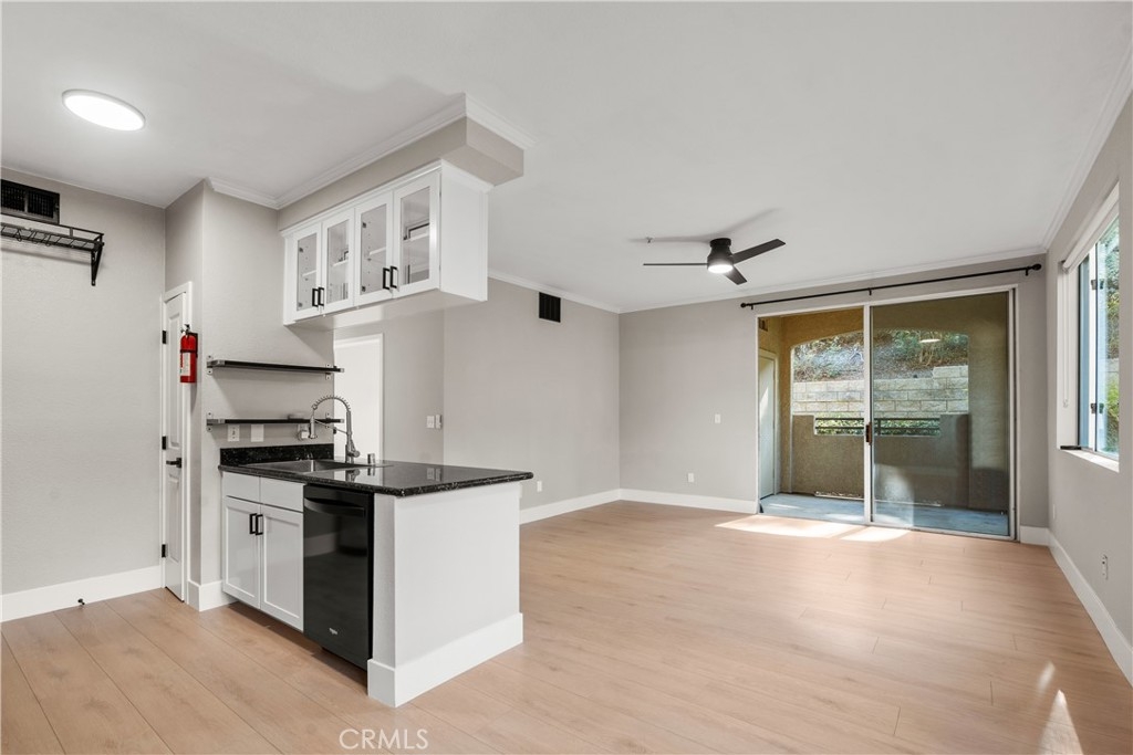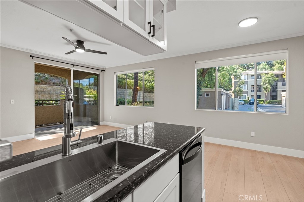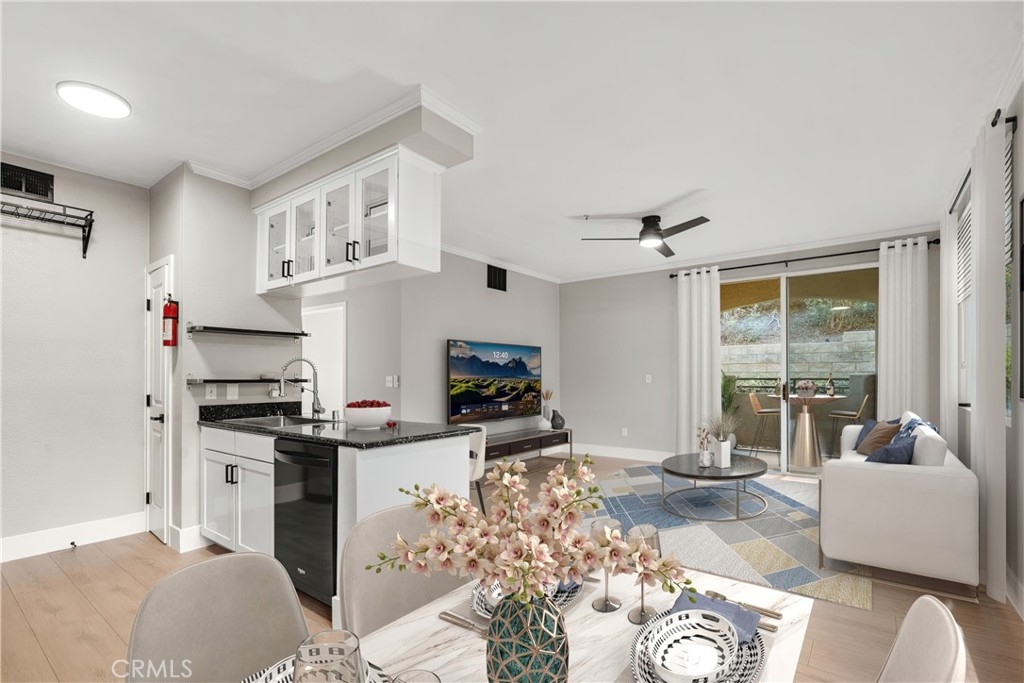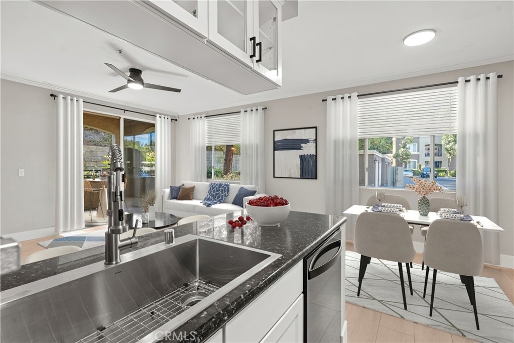 Charming Upgraded Ground-Level Unit with Garage! Discover the perfect blend of comfort and style in this upgraded ground-level unit, featuring no stairs and a convenient one-car garage. The modern kitchen boasts shaker-style cabinets, sleek stainless steel appliances, and elegant granite countertops, making it a culinary delight. Enjoy the inviting ambiance created by upgraded flooring, baseboards, and crown molding throughout most of the home. The spacious main bedroom offers a generous walk-in closet, while the second bedroom provides flexibility—please note it does not include a wardrobe closet. With large windows flooding the space with natural light, this home feels bright and airy. Step outside to your private patio, complete with a storage closet for added convenience. Partial repiped (new plumbing) HOA managed. The laundry closet can fit a full-size side by side washer and dryer, ensuring ease of use. Located in the well-designed Canyon Point community, residents can take advantage of the pool, spa, and fitness center. This unit is conveniently situated near schools, parks, entertainment options, and a variety of dining experiences, from casual to fine. Plus, enjoy easy access to the freeway and toll road for effortless commuting. Don’t miss out on this gem—schedule a viewing today!