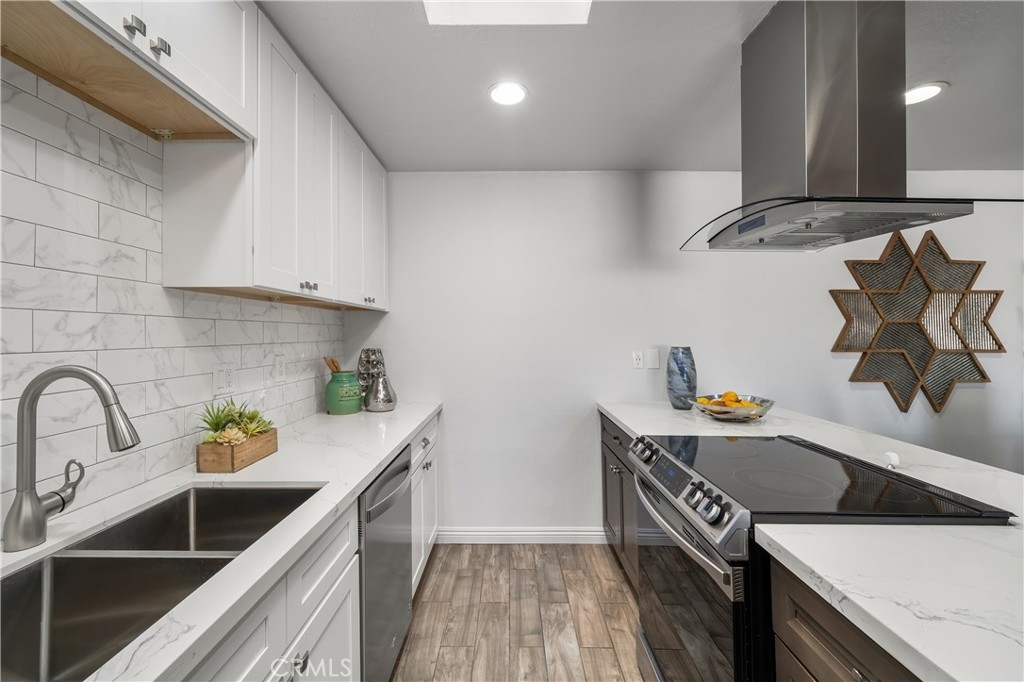 Discover this beautifully renovated 3-bedroom, 2-bathroom single-story townhome in Aliso Viejo, boasting a spacious, open-concept floor plan designed for modern living. The stunning new kitchen features quartz waterfall countertops, stylish two-tone cabinets, an island-mounted range hood with tempered glass and LED lighting, and a skylight that fills the space with natural light. The home offers a blend of elegant tile and luxury vinyl plank flooring throughout, complemented by retextured ceilings, crown molding, ceiling fans, and recessed lighting. Energy-efficient upgrades include new vinyl windows and sliding door, a smart thermostat, a brand-new HVAC system, and a new water heater. The remodeled bathrooms showcase quartz countertop vanities, large-format tile flooring, decorative tile shower floors, and frameless glass doors. Step outside to enjoy a private, enclosed patio perfect for relaxing or entertaining. Community amenities include two sparkling pools, a community center, and a nearby park with tennis courts. Conveniently located near shopping, dining, and entertainment options, this home is just 7.3 miles from the stunning shores of Laguna Beach with easy access to major freeways. Don’t miss the opportunity to own this exceptional townhome.