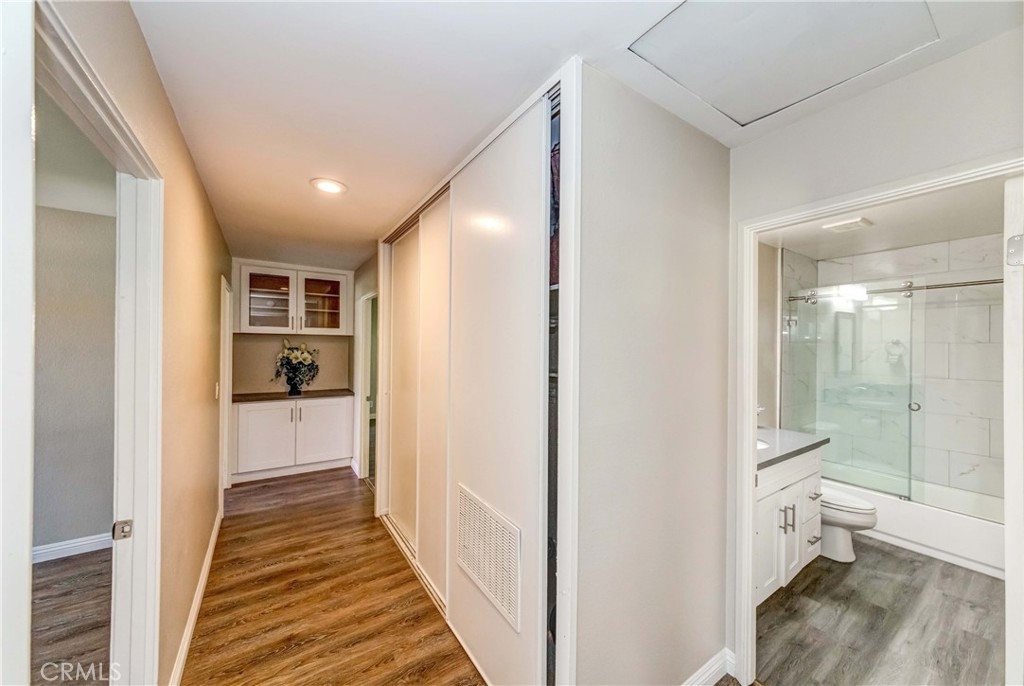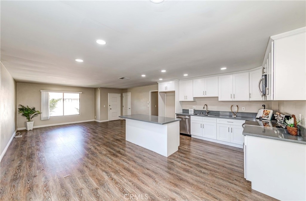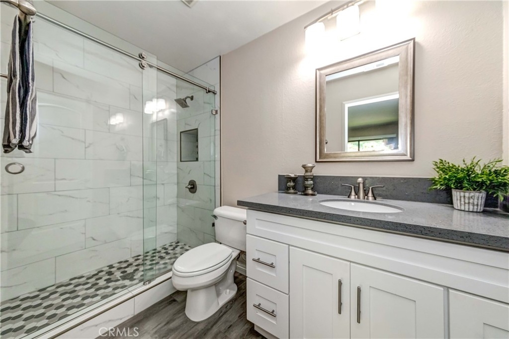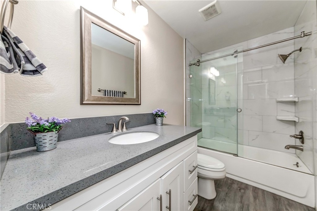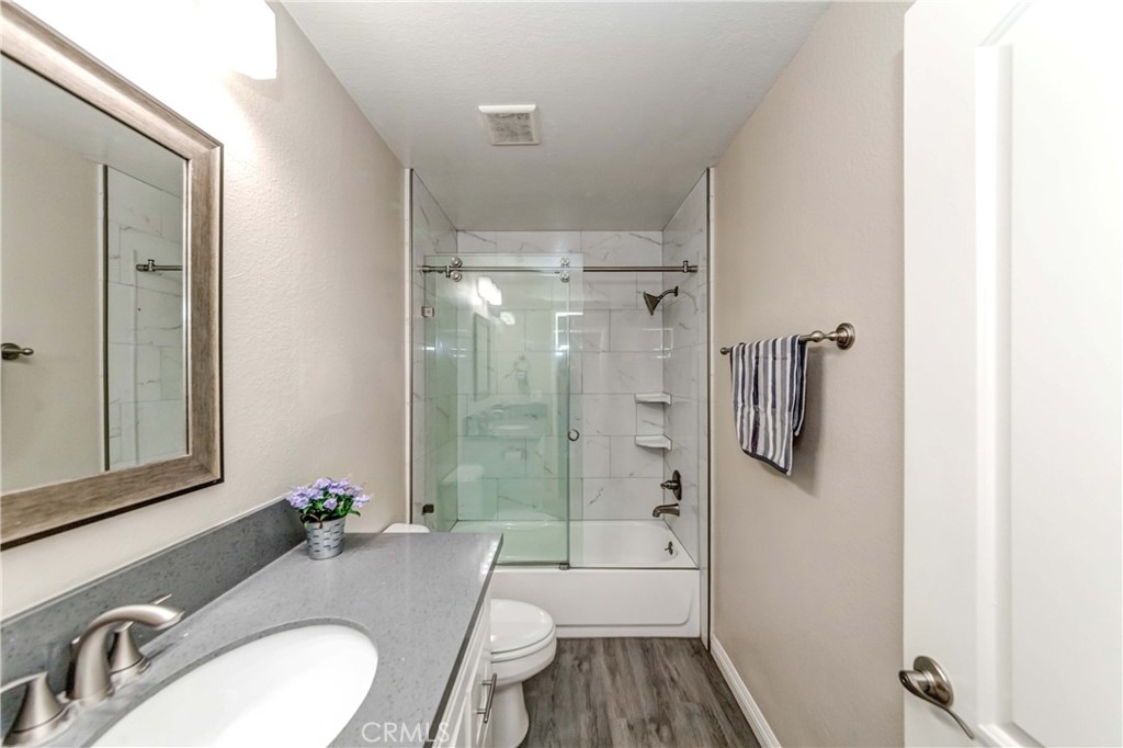Ready to move in, single-story townhome with spacious, open floor plan. Remodeled just a couple years ago with completely new HVAC system. Three bedrooms and two full baths. Kitchen and bathrooms have been upgraded with quartz countertops and cabinets. Dining area opens up to a cozy family room, making for a great entertaining space. Neutral colors throughout with beautiful laminate flooring. Enclosed patio with solid block wall for added privacy, which is an upgrade from the standard wood fencing. Detached two-car garage with built-in overhead storage space. Association amenities include plenty of guest parking, gorgeous pool and spa. Located close to freeways, schools, restaurants, shopping.