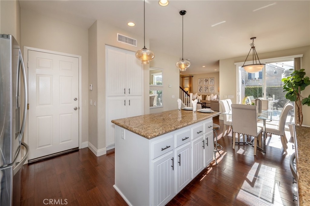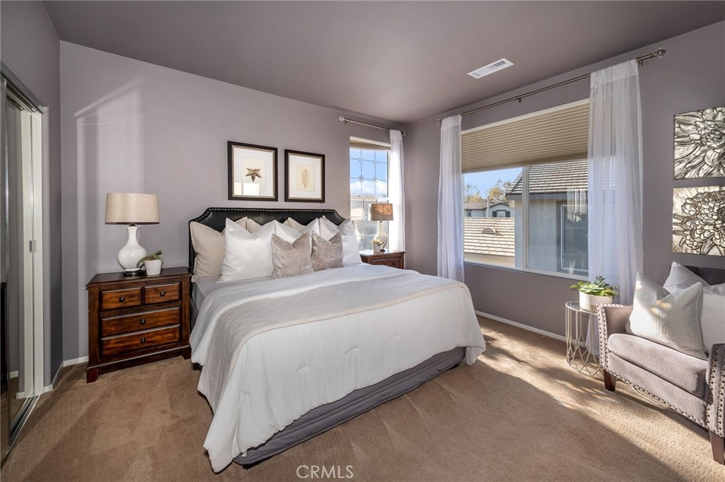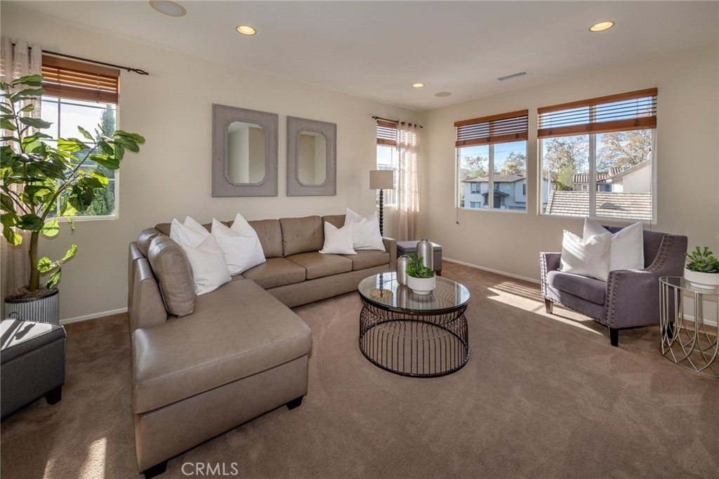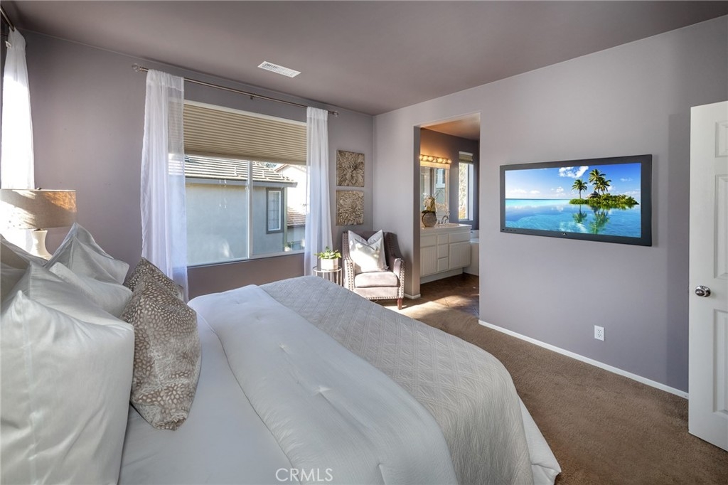 This beautiful, highly upgraded, turn-key home on a corner lot offers four bedrooms and a large loft area upstairs with built-in cabinets. A full bedroom and bathroom can be found on the downstairs main level. Gleaming hardwood floors on the main level and gourmet kitchen featuring white designer cabinets, granite countertops, upgraded SS appliances including refrigerator, center island/breakfast bar, pendant lighting and stone mosaic backsplash. The kitchen opens to a private dining area and living room with cozy fireplace and builder installed surround sound system. Open the large sliding glass door to the outdoor entertaining backyard. Enjoy alfresco dining and entertaining in an outdoor oasis with a built in stainless steel BBQ island including refrigerator for your enjoyment while sitting in you own private backyard spa or gathering around the firepit under the string lights. Recently installed artificial turf looks great and low maintenance! Ascend to the spacious master bedroom offering a walk-in closet with custom built-ins to make your closet well organized. The gleaming white tile master bathroom offers two sinks, separate shower and spa tub for the ultimate relaxation at the end of a long day. 2 additional secondardart bedrooms upstairs share a full bathroom and view balcony. The garage features custom cabinets, a work bench, epoxy coated floor and storage area with pull down ladder to store all your seasonal items. Other features include alarm system, washer/dryer, full driveway and custom window coverings. Hurry, this immaculate home will not last!