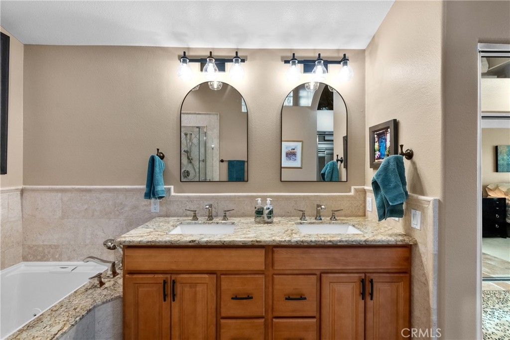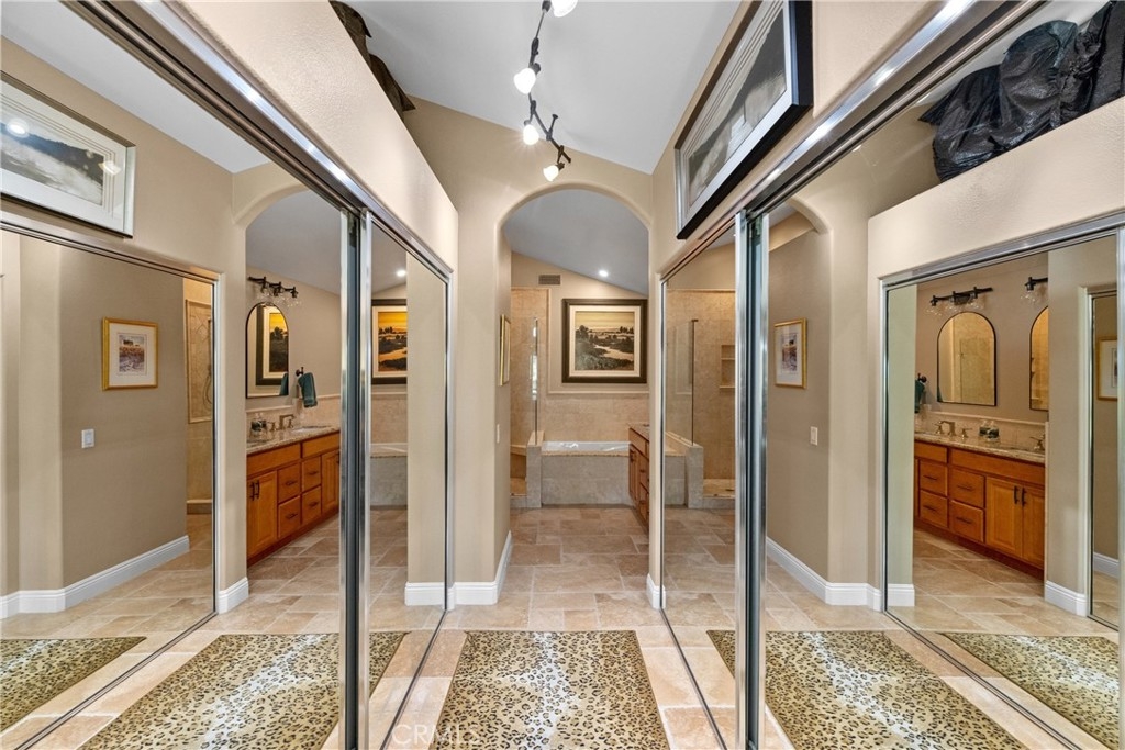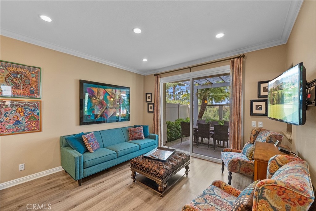 Welcome to this beautifully upgraded Tuscan-style home in the desirable California Renaissance community of Aliso Viejo. Step inside to soaring cathedral ceilings and an abundance of natural light in the formal living room, which flows seamlessly into the dining area, bar, and family room—perfect for comfortable living and entertaining. The kitchen is equipped with stainless steel appliances, granite countertops, a counter-depth fridge, built-in microwave, recessed lighting, and undercabinet lights. Luxury waterproof vinyl flooring runs throughout the living areas, kitchen, stairs, and hallways. Cozy up by the fireplaces in both the living room and the spacious primary suite, each framed with tumbled travertine and custom wood mantels. The primary suite features dual custom closets and a spa-like bath with a walk-in travertine shower, deep jetted tub, and dual granite vanitiy. Step out onto the private deck and take in peaceful eastern mountain views. Two additional bedrooms with built-in closets share an upgraded bathroom with a glass-enclosed travertine shower. Enjoy easy indoor-outdoor living with large patio doors opening to a serene backyard featuring low-maintenance landscaping, a built-in fountain, mature hedges for privacy, and a covered patio area. Additional highlights include ceiling fans in every room, an EcoBee smart HVAC system, ADT alarm system, and a two-car garage with EV charger and epoxy flooring. Enjoy a resort-like pool and spa in the community a well! Close to Laguna Wilderness Park, SOKA University, Aliso Viejo Town Center, The Commons, city parks, sports fields, and miles of hiking and biking trails. You won't want to miss this opportunity!