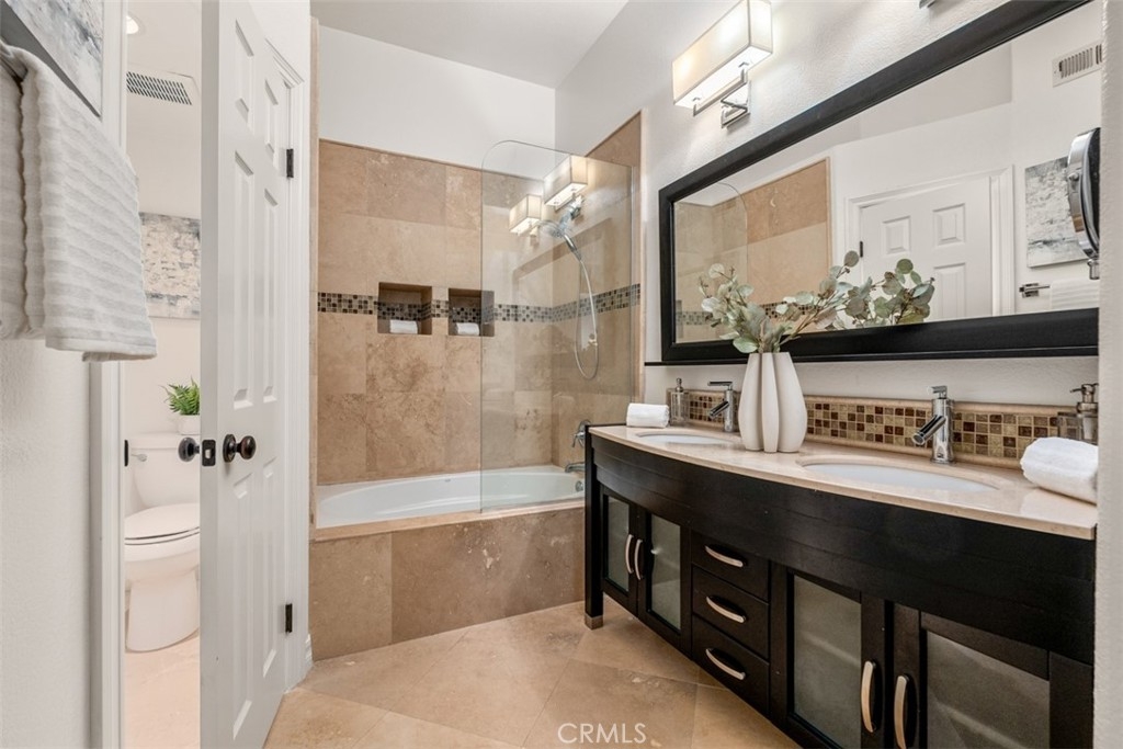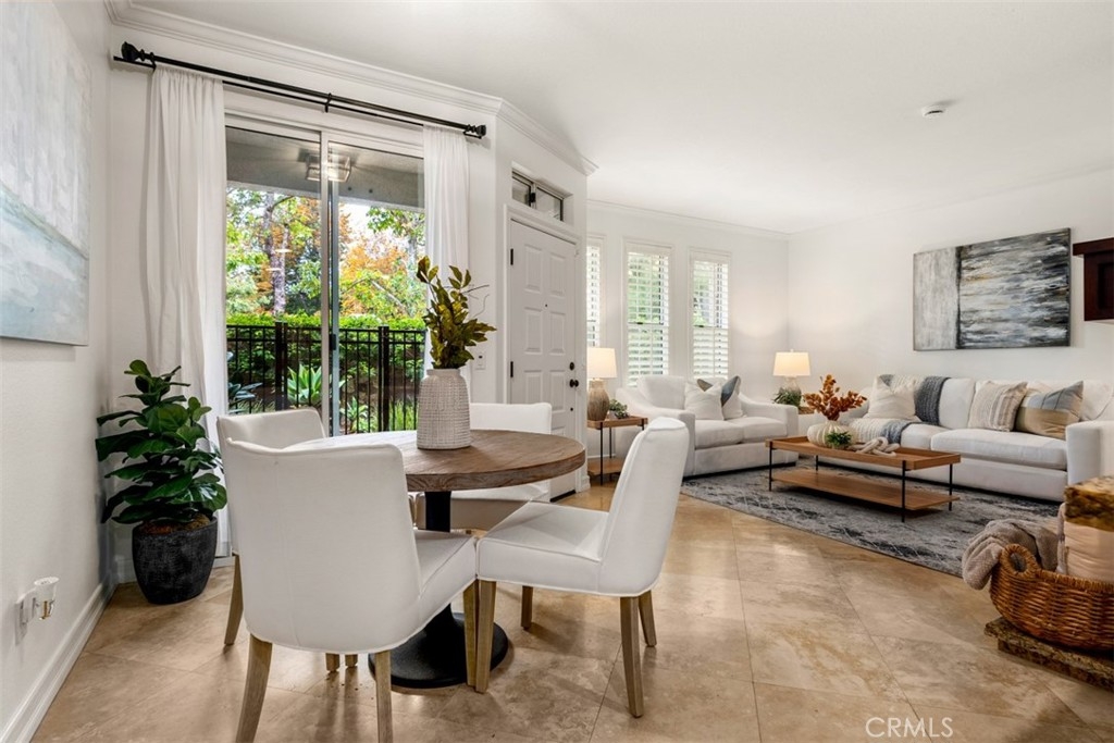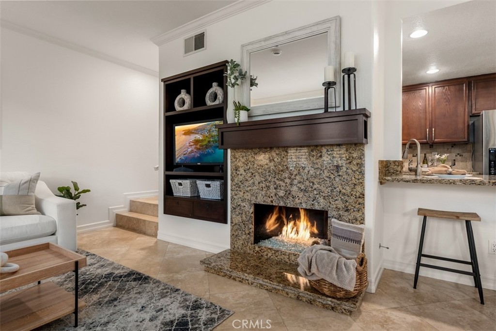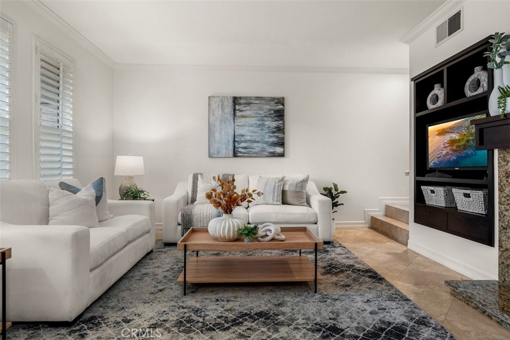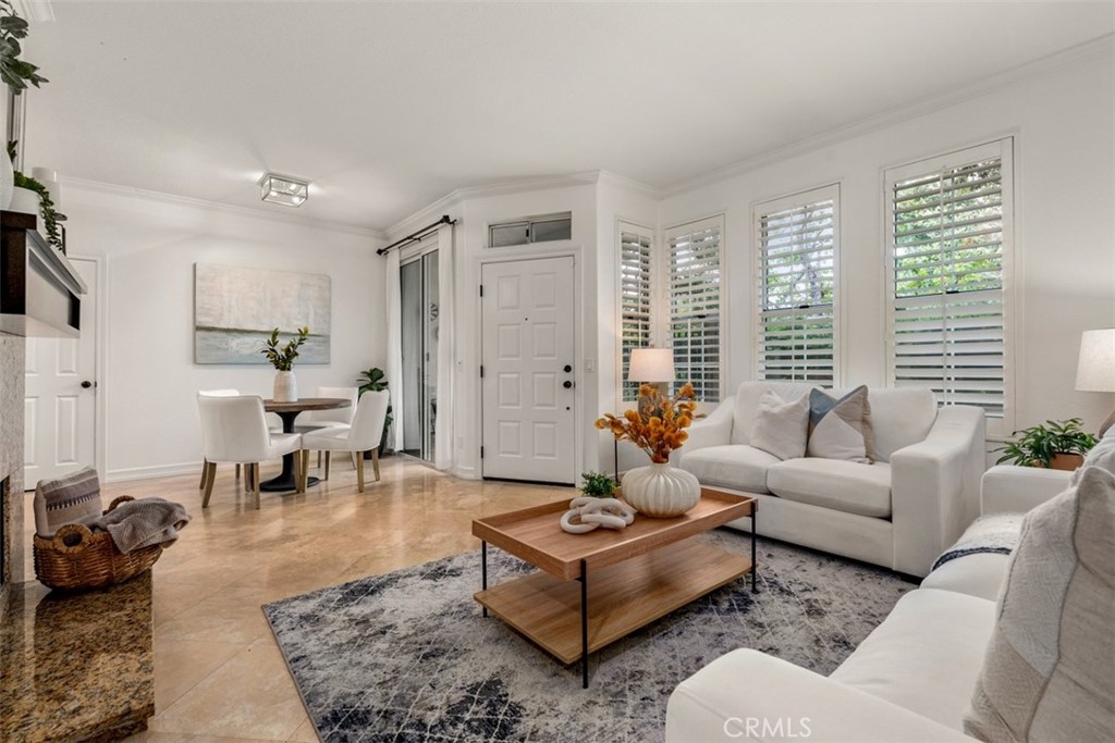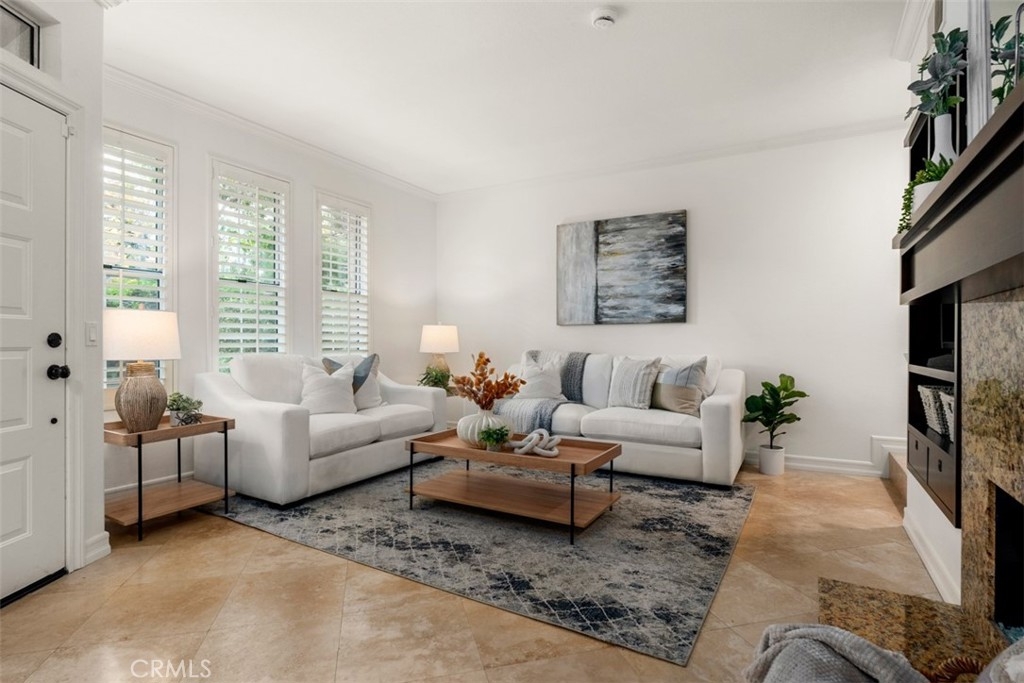 Experience luxury living in this beautifully upgraded 2-bedroom, 2.5-bathroom townhome located in the highly sought-after Seacove Place community of Aliso Viejo. This private, light-filled two-story home offers a desirable layout with no neighbors above or below. Just minutes from the coast and iconic Laguna Beach, it perfectly blends style, comfort, and location. The first floor features travertine tile flooring, custom plantation shutters, crown molding, baseboards, a cozy fireplace, and a convenient powder room. The laundry room is situated just off the kitchen, which boasts granite countertops, stainless steel appliances, ample storage, and an in-kitchen pantry. The dining area flows seamlessly to a gated front patio, ideal for entertaining. Upstairs, the spacious primary suite offers high ceilings, abundant natural light, two large closets, and an ensuite bathroom with dual vanities, a separate toilet room for added privacy, and a marble travertine shower with a glass enclosure. The second bedroom includes a walk-in closet, high ceilings, and a ceiling fan. The remodeled secondary bathroom features marble tile floors and shower walls, a glass enclosure, and a marble vanity. Additional highlights include central air conditioning, in-unit laundry, an attached 1-car garage, and a reserved parking space. The Seacove Place community offers resort-style amenities, including pools, spas, picnic areas, dog-friendly walking paths, and ample guest parking. Located in a private interior section of the community, you’re close to parks, shopping, walking trails, and top-rated schools. Whether you’re a first-time homebuyer or seeking a stylish coastal retreat, this move-in-ready home is not to be missed. Water and trash services are included in the HOA.