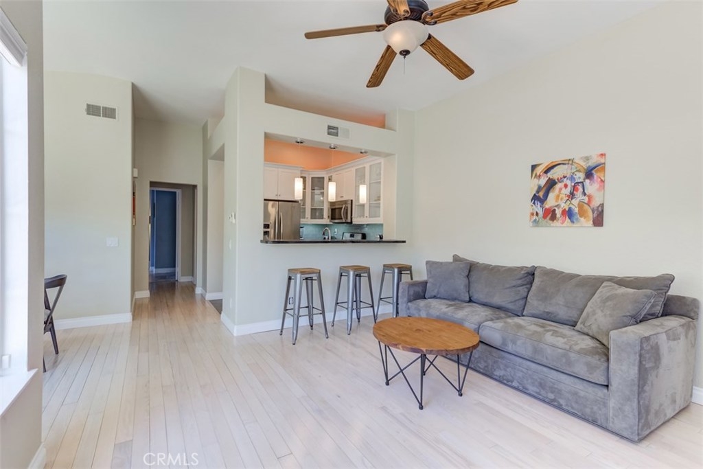 Spacious and gorgeously upgraded home in the gated Windflower Community. One of only a few Carriage end-units offering excellent privacy and high ceilings. The home is truly turn key! To start, the kitchen has been completely remodeled from top to bottom. All new soft close shaker cabinetry, custom granite counter tops, stainless steel appliances including fridge, LED under-cab/over-cab lights, and subway tile back-splash. The bathrooms as well have been very tastefully updated with all new modern fixtures, new vanity cabinets, frame-less shower enclosures, custom tile showers, new mirrors, and lighting. The entire home has been upgraded with new wood flooring and travertine flooring, designer interior paint colors, custom baseboards, all new window coverings, ceiling fans, and a new sliding glass door to the private balcony. The large over-sized balcony perfect for BBQ’s and entertaining. The gas fireplace was also recently been installed and fires up with the touch of a remote. In the hallway is located a new dual temp wine chiller. One car attached garage with epoxy floors, new cabinetry, new garage door opener, and private laundry facility (includes new washer and dryer). One additional nearby carport with extra storage cabinets. Only steps away from Aliso Viejo Town Center, filled with stores, restaurants, and entertainment, and conveniently located near the 73 toll-road. The schools are all top rated schools in Orange County. Come see this home before it goes fast!