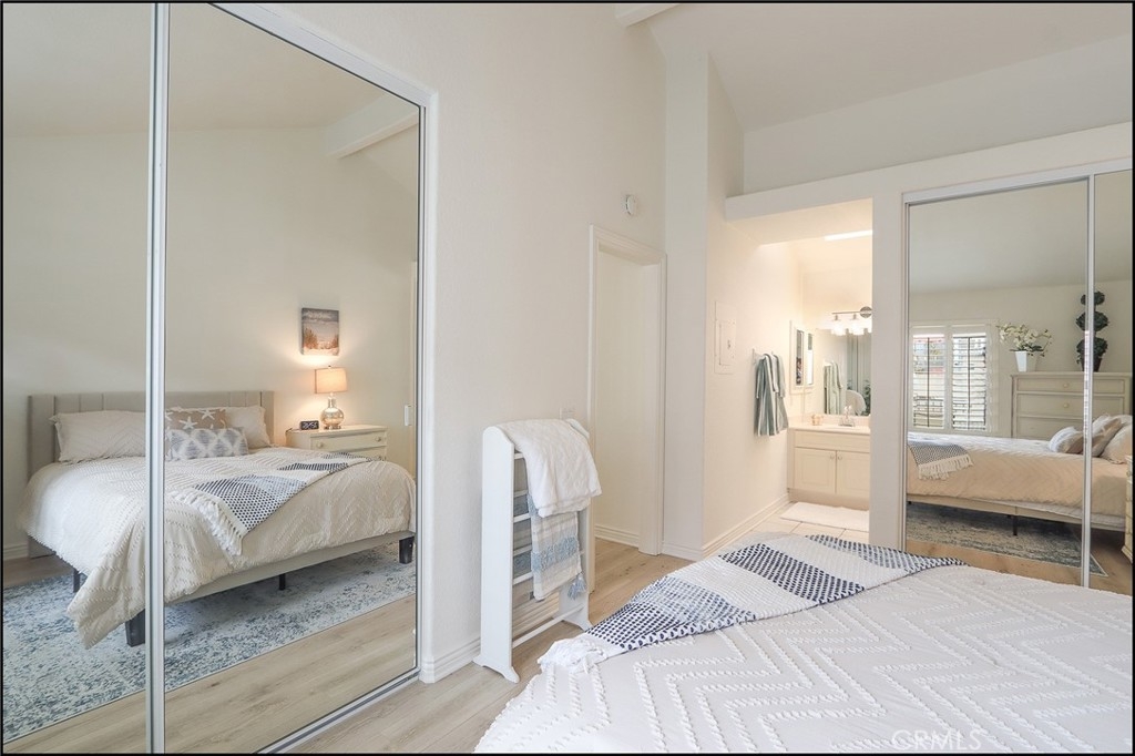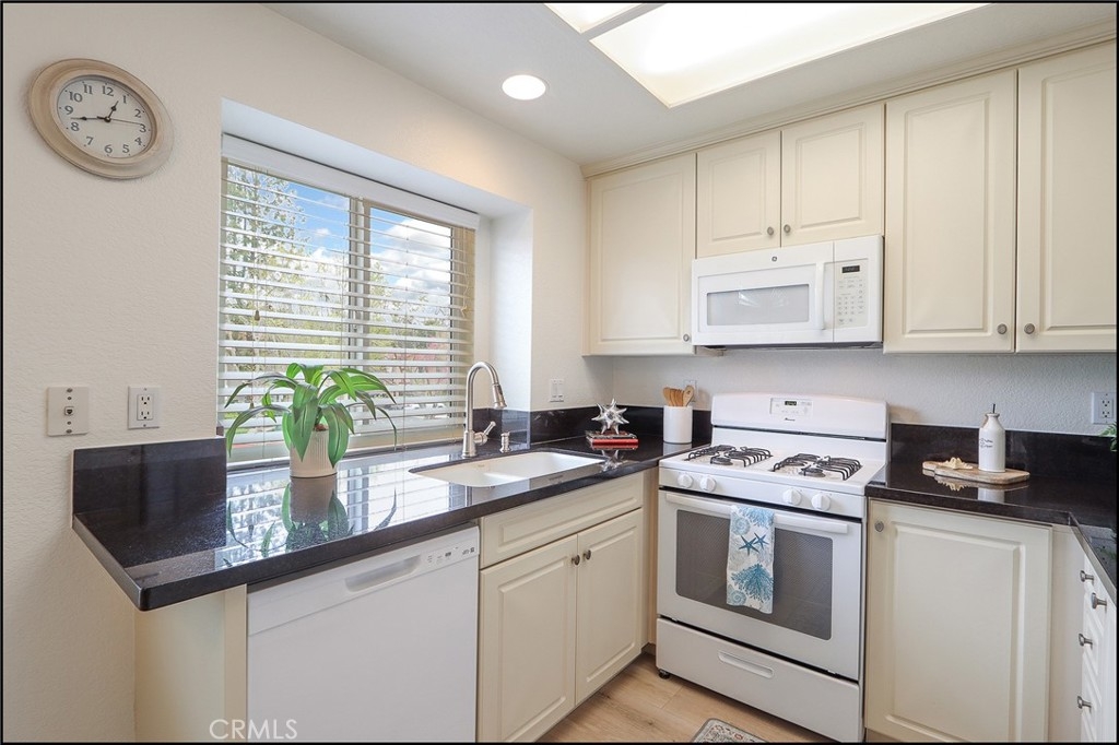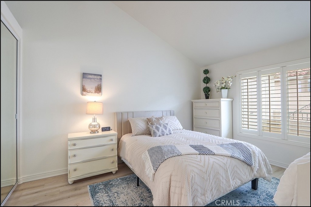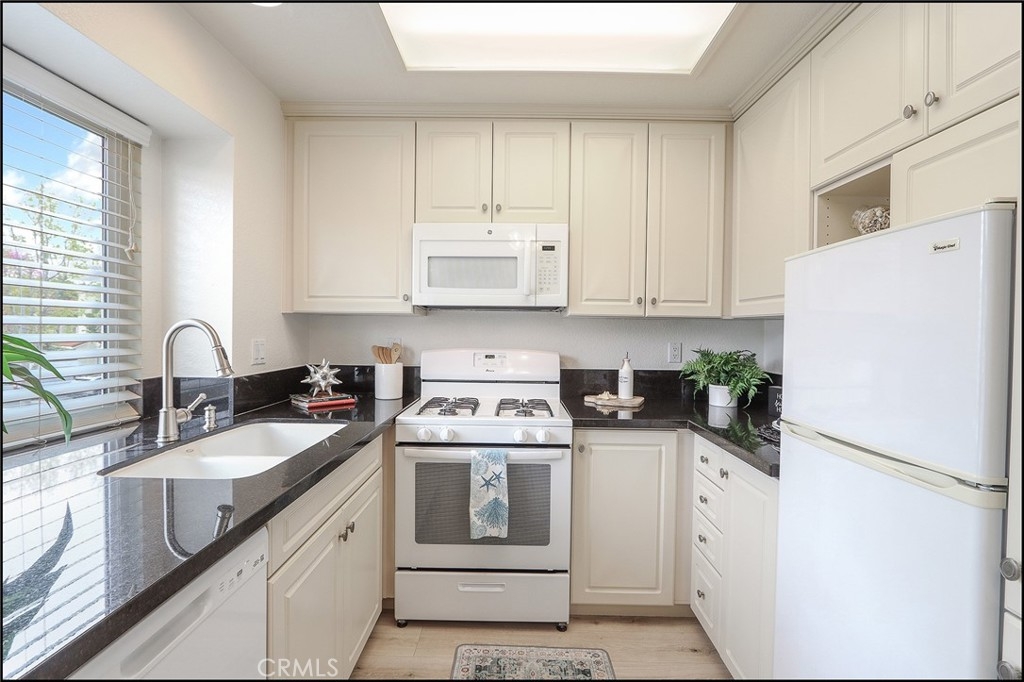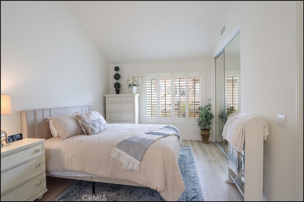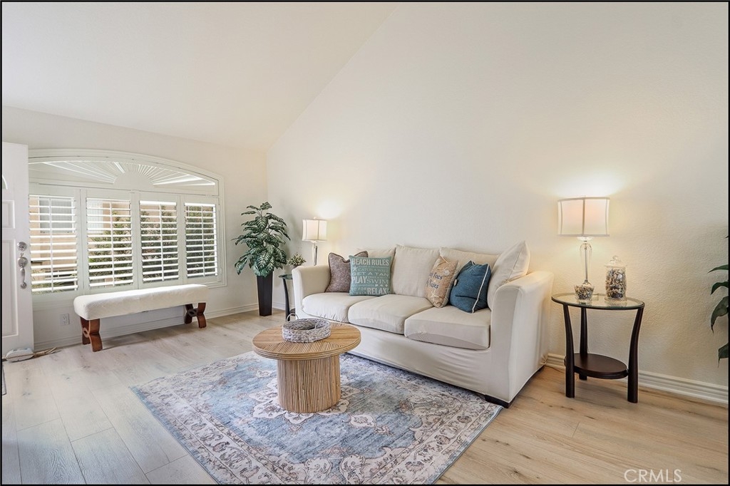 EXCEPTIONAL CARRIAGE UNIT WITH NO ONE LIVING ABOVE OR BELOW! MODEL PERFECT AND UPGRADES THROUGHOUT! Open and airy floor plan offering a spacious living and dining room with vaulted ceilings and large windows to bring in plenty of natural light. Stunning kitchen has been upgraded with granite countertops, upgraded appliances including a new dishwasher and new garbage disposal, designer style sink and faucet. Newer HVAC as of 2024, fresh interior paint, upgraded dual pane windows, custom plantation shutters, retractable screen door, upgraded LVP flooring and upgraded baseboards, upgraded lighting including ceiling fan light fixture. Spacious master suite with vaulted ceilings, two closets with mirrored closet doors and master bathroom featuring tub & shower with upgraded door, upgraded fixtures and lighting and full size washer and dryer area. There is also a private deck with plenty of space to enjoy your morning coffee or outdoor dining. One-car garage plus guest parking directly across, resort style community pools and spas, clubhouse, bbq area, large greenbelts with rose garden, water and trash services are included in the HOA. Awesome location with easy toll road (73) and beach access (via 133), excellent proximity to Aliso Viejo Town Center with shops, restaurants and entertainment, highly sought after Laguna Beach schools and nearby hiking, biking and nature trails!