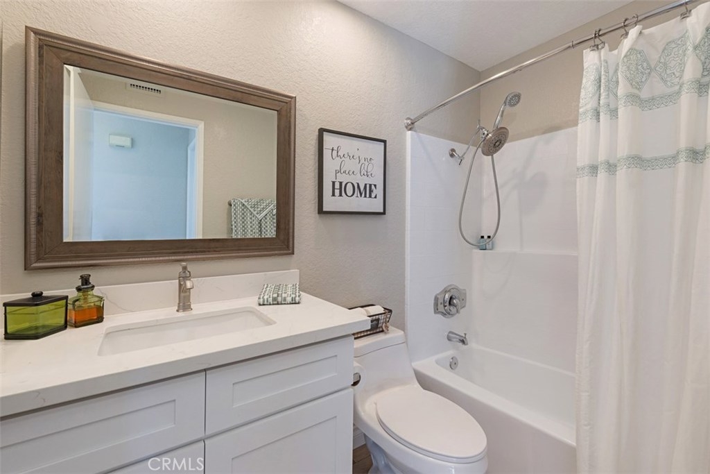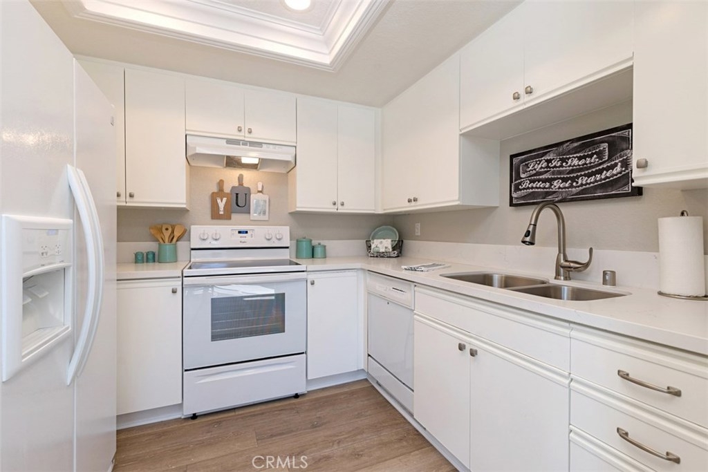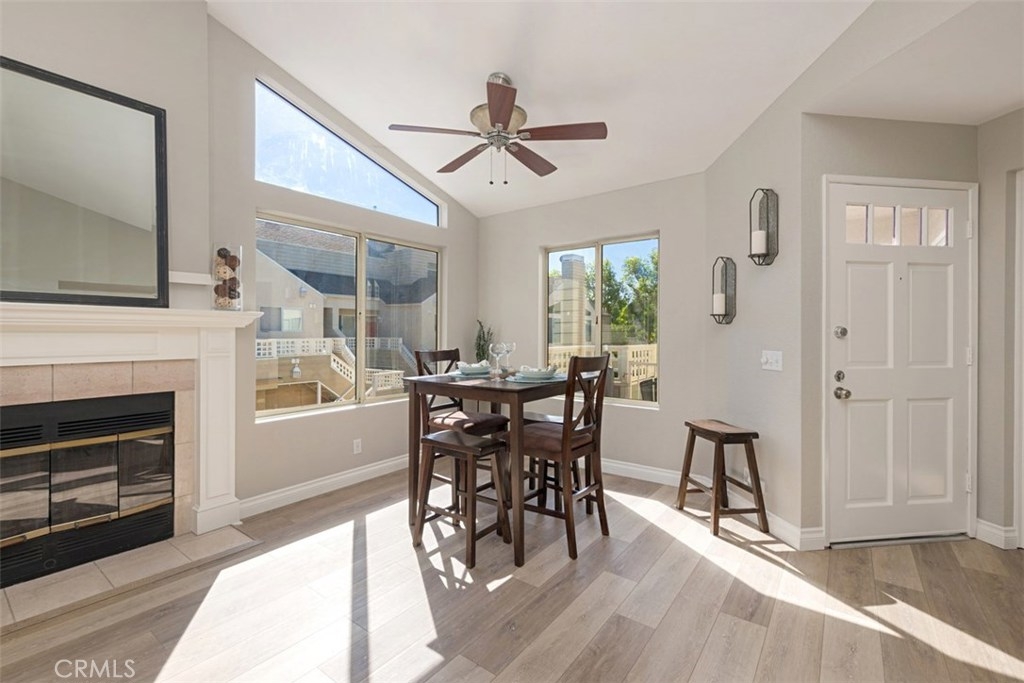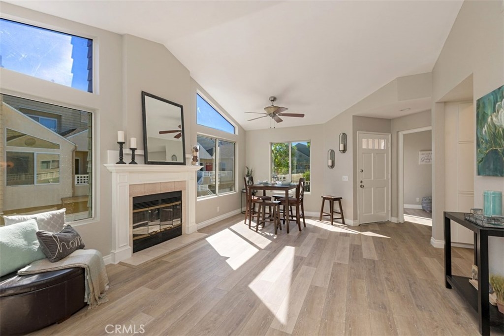 COMPLETELY REMODELED, VAULTED CEILINGS! The home has just been completely remodeled from top to bottom with WOOD LOOK VINYL FLOORING and custom paint throughout, plus newly updated kitchen and bath. It features a large open living and dining area with vaulted ceiling, fireplace and mantle and abundant light from windows including two large transverse ones silhouetting the vaulted ceilings The kitchen features new quartz counters, stainless sink and faucet, new stove, LED recessed lighting, side by side refrigerator, dishwasher. The newly remodeled bath is highlighted with new cabinetry, quartz counters wood vinyl flooring and new recessed LED lighting and framed mirror. The tub/shower features two shower heads, one hand held and one waterfall. The generously sized master suite has vaulted ceilings, lots of light from the beautiful transverse windows, and a walk in closet. There is a 2nd bedroom with a sliding glass door that opens to the patio. Also included are a full size front load newer washer and dryer in the home! The patio has plenty of room for relaxing and grilling. The home features a finished ONE CAR GARAGE AND NEW ENERGY EFFICIENT A/C AND FURNACE IN 2016. The recreation center just across the street has newer fitness equipment, weights, large pool, spa, and tennis court. In addition there are two parks on each side of the complex which is nestled against mature trees and walking trail. This is an outstanding location!