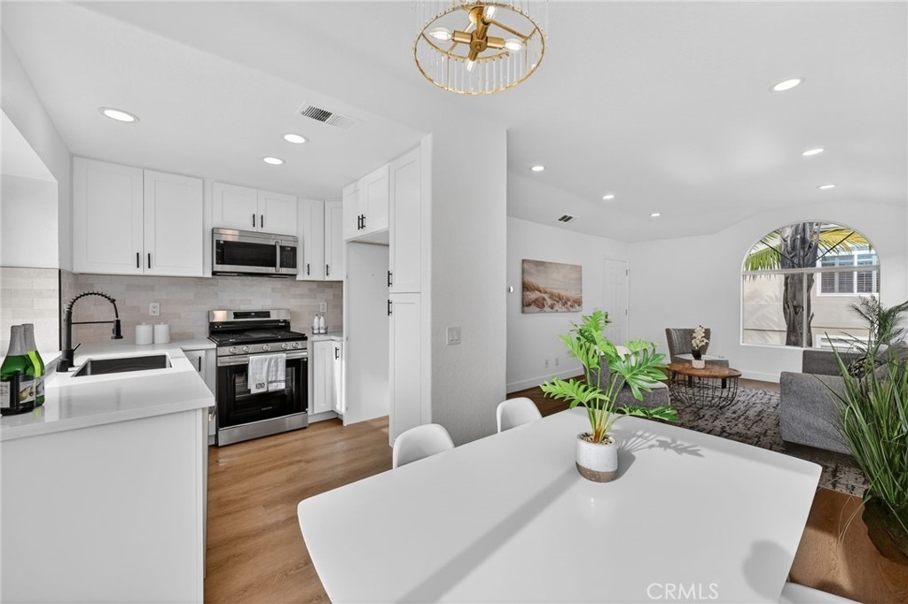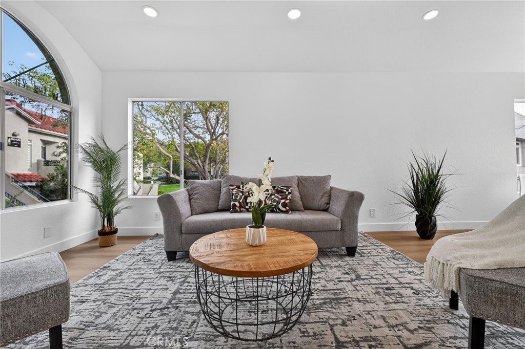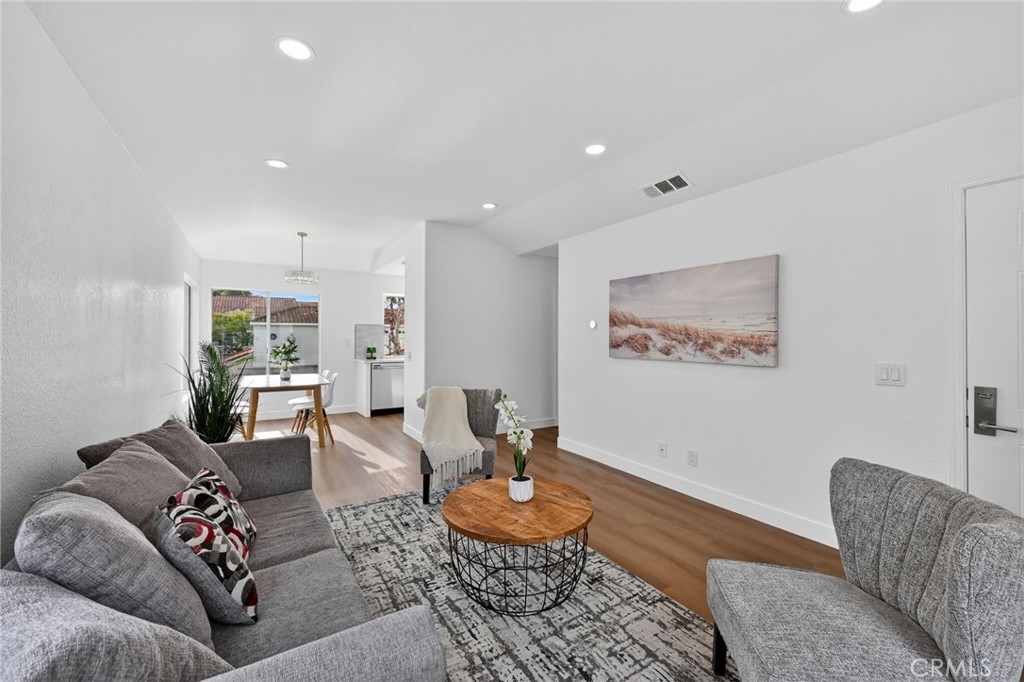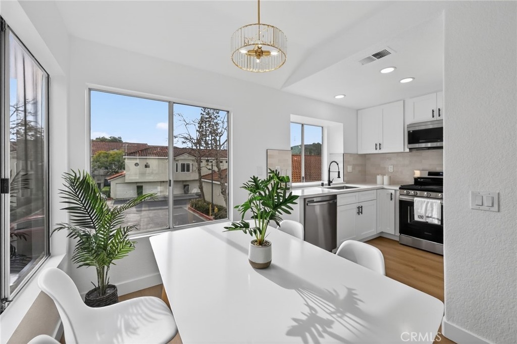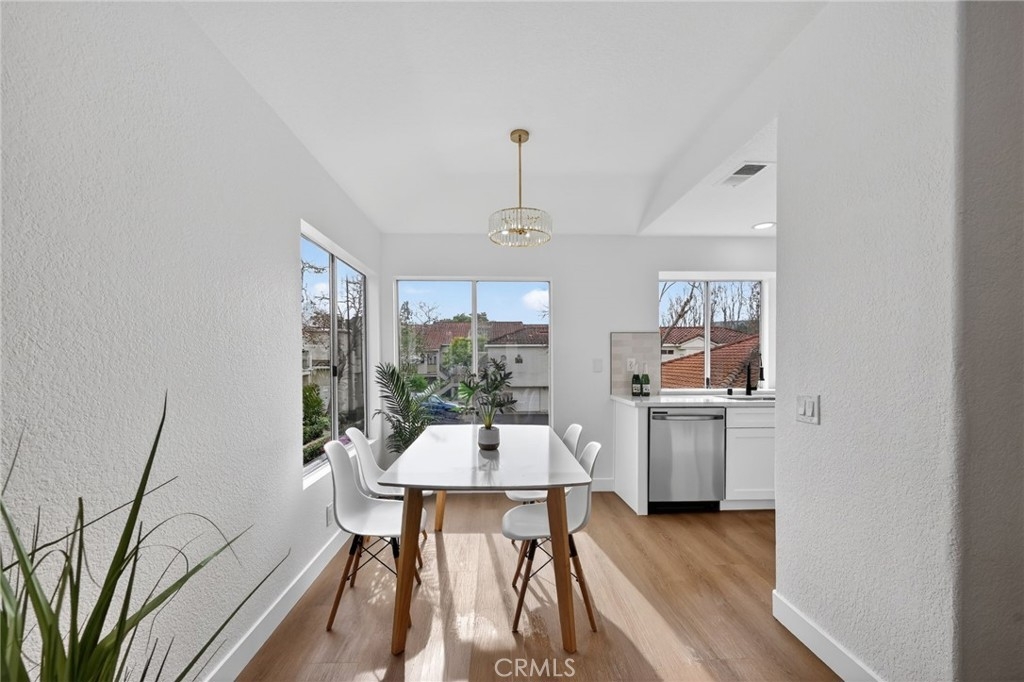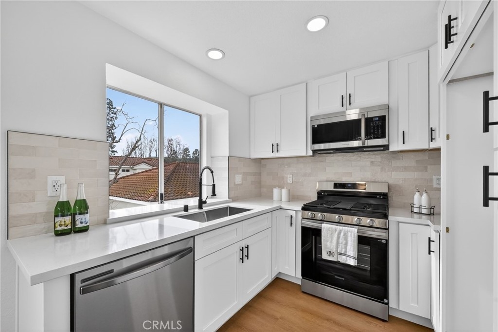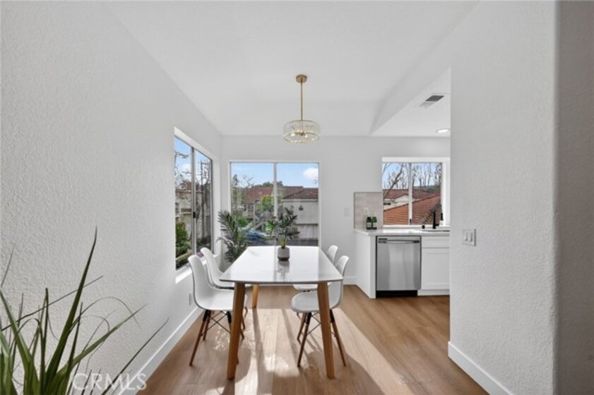 Light, fresh and fully updated. Welcome to such an inviting upper-level home in the Seagate Colony community of Aliso Viejo. This one-bedroom residence combines a bright, modern interior with rare privacy, offering no neighbors above or below and a comfortable, open layout that lives larger than its square footage. Natural light fills the main living and dining areas, enhanced by wide-plank flooring, bright white walls, and recessed lighting that create a calm, contemporary feel. The kitchen is thoughtfully designed with white shaker cabinetry, black hardware, stainless steel appliances, and sleek countertops, opening to the dining space for easy everyday living and entertaining. The bedroom is a peaceful retreat with vaulted ceiling and mirrored closets, while the adjacent bath features a walk-in shower with modern tile, a 10-inch matte black rainfall shower system, and an LED mirror for a subtle spa-like touch. A private patio extends the living space outdoors and includes enclosed laundry for added convenience. The home also offers a detached one-car garage, newer AC, a tankless water heater, and Nest thermostat. Seagate Colony residents enjoy a community pool, spa, fitness center, beautiful landscape areas, with HOA dues covering water, trash, exterior building maintenance, and common areas—supporting a low-maintenance lifestyle in a convenient Aliso Viejo location close to parks, shopping, dining, and coastal access. Move-in ready with designer-style finishes throughout, this home offers comfort and effortless living—an exceptional find in Aliso Viejo!