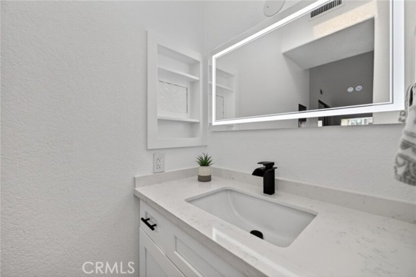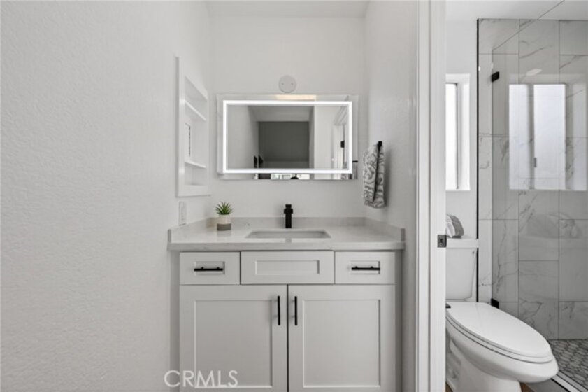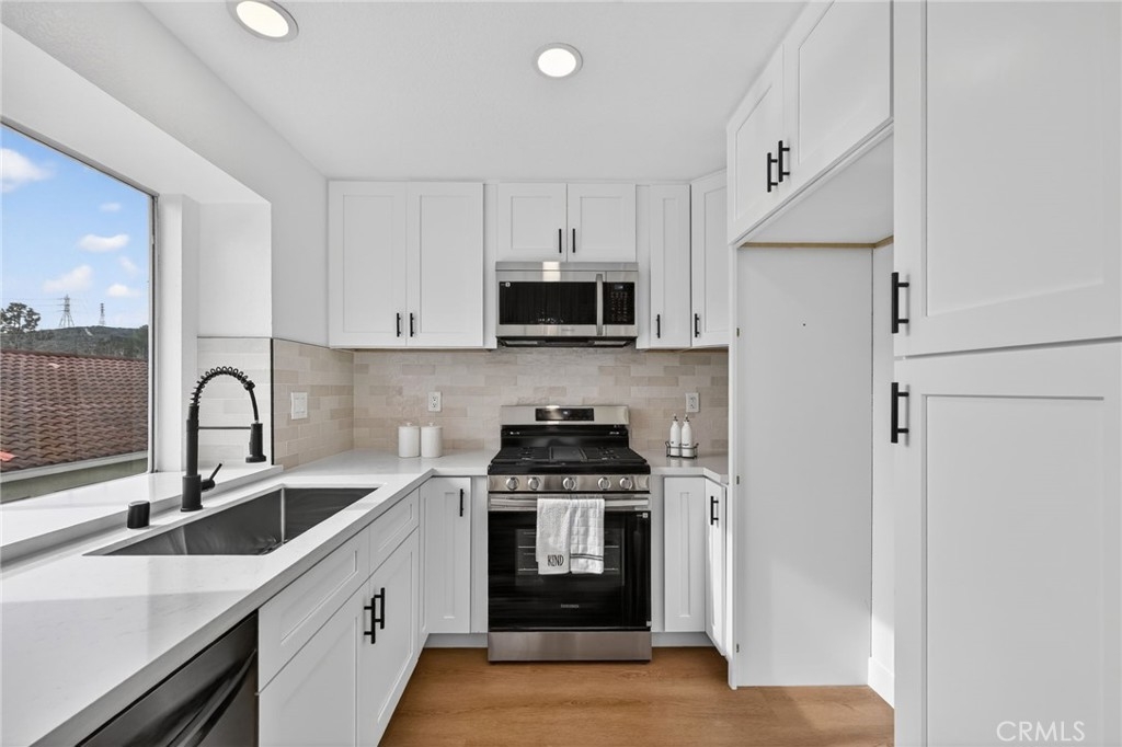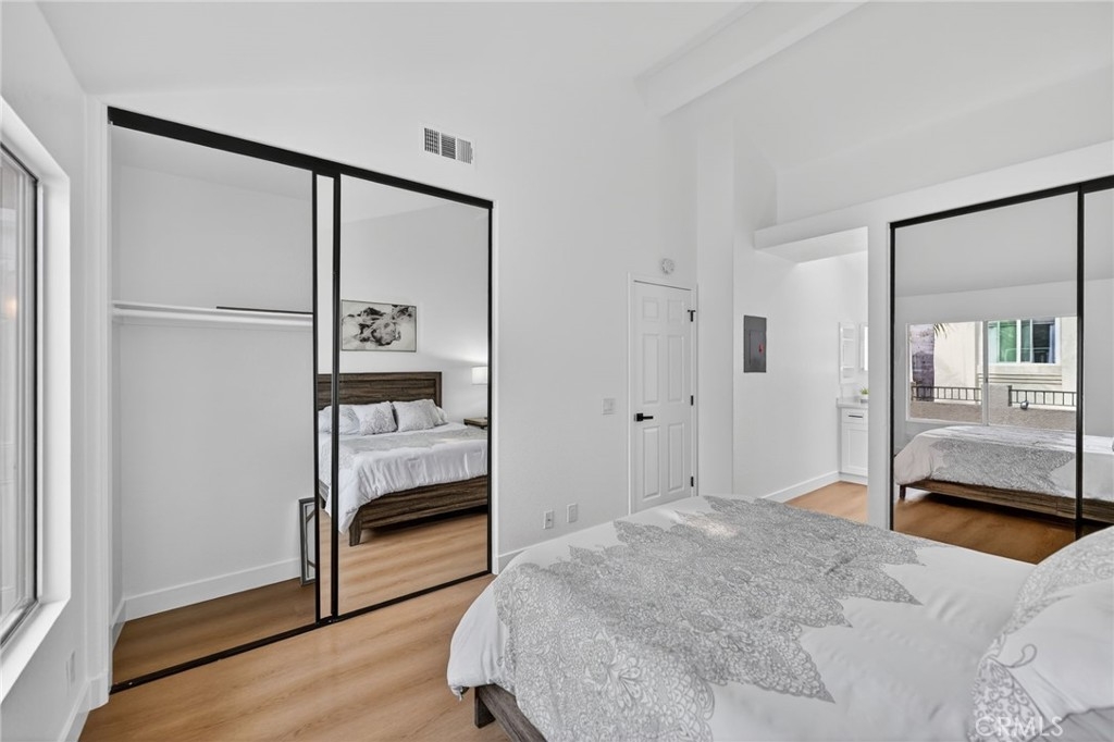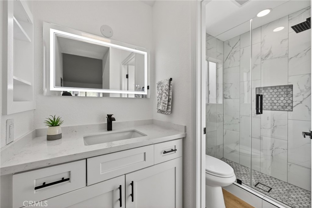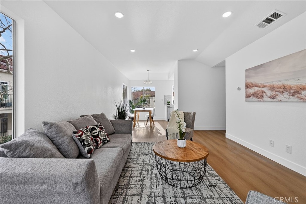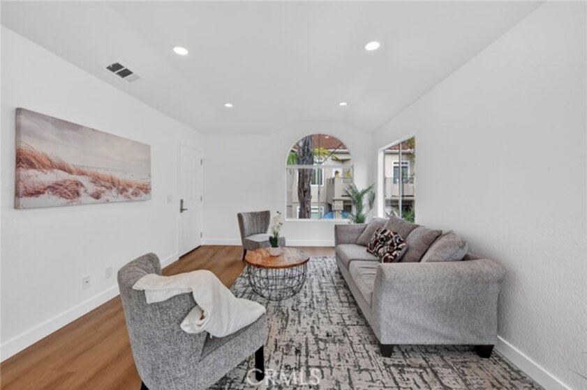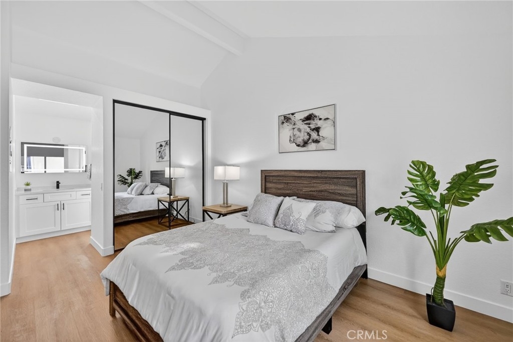 Light, fresh and fully updated. Welcome to such an inviting upper-level home in the Seagate Colony community of Aliso Viejo. This one-bedroom residence combines a bright, modern interior with rare privacy, offering no neighbors above or below and a comfortable, open layout that lives larger than its square footage. Natural light fills the main living and dining areas, enhanced by wide-plank flooring, bright white walls, and recessed lighting that create a calm, contemporary feel. The kitchen is thoughtfully designed with white shaker cabinetry, black hardware, stainless steel appliances, and sleek countertops, opening to the dining space for easy everyday living and entertaining. The bedroom is a peaceful retreat with vaulted ceiling and mirrored closets, while the adjacent bath features a walk-in shower with modern tile, a 10-inch matte black rainfall shower system, and an LED mirror for a subtle spa-like touch. A private patio extends the living space outdoors and includes enclosed laundry for added convenience. The home also offers a detached one-car garage, newer AC, a tankless water heater, and Nest thermostat. Seagate Colony residents enjoy a community pool, spa, fitness center, beautiful landscape areas, with HOA dues covering water, trash, exterior building maintenance, and common areas—supporting a low-maintenance lifestyle in a convenient Aliso Viejo location close to parks, shopping, dining, and coastal access. Move-in ready with designer-style finishes throughout, this home offers comfort and effortless living—an exceptional find in Aliso Viejo!